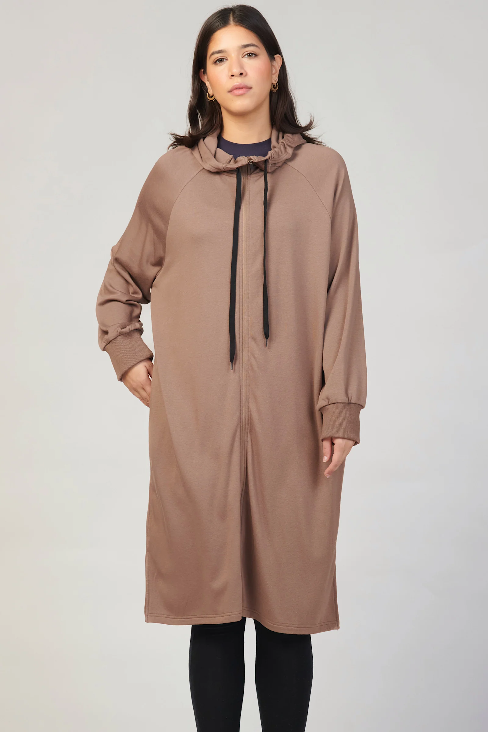 This long hoodie dress offers ample coverage, making it perfect for layering over leggings.