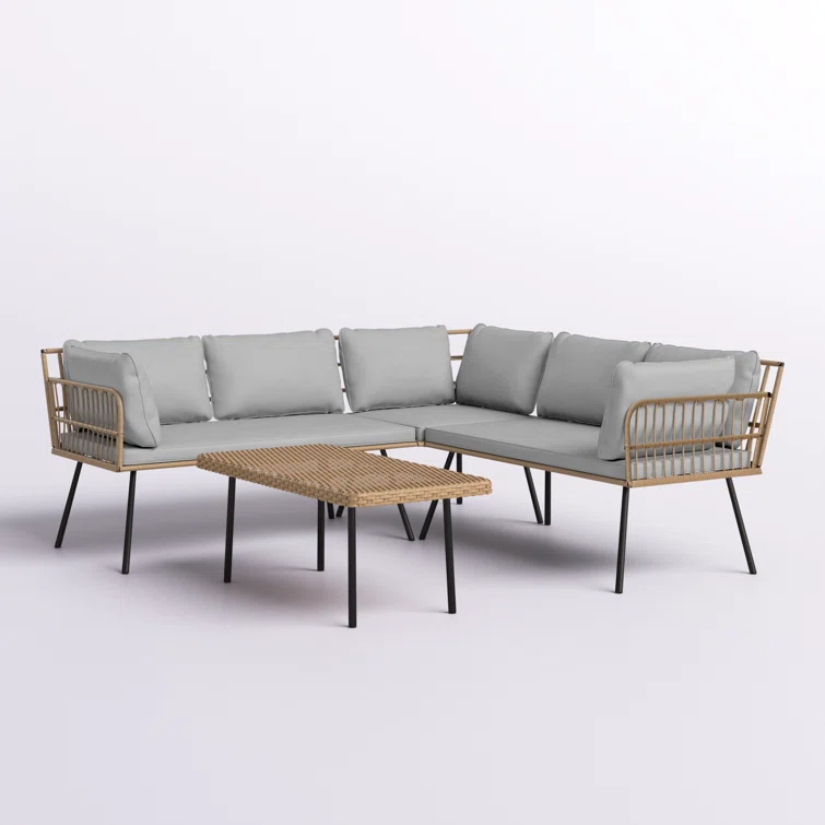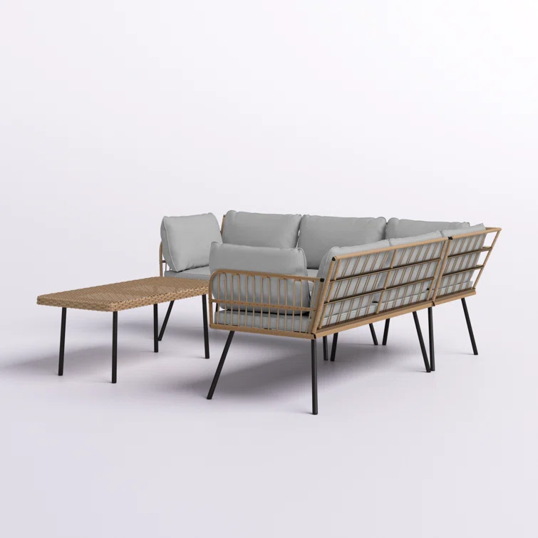 This 3-piece outdoor seating group pairs a low-profile silhouette with a mid-century look that elevates any corner of your patio. It includes a sectional and a table, both crafted with a weather-resistant powder-coated steel frame, and they rest on sleek, splayed legs that keep sightlines clear. Woven wicker accents are wrapped around each piece for plenty of breezy, coastal vibes. The L-shaped sectional is padded with plush white back and seat cushions that keep you supported while you lounge. Plus, the table adds the right amount of surface space for drinks and snacks.