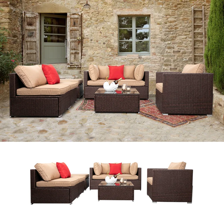 Make the most of your outdoor space with this seven-piece patio rattan furniture set, a great place to gather your friends and family to have an enjoyable and fantastic relaxation time. It includes 2 corner chairs, 2 armless chairs, 1 single-person chair, 1 ottoman, and 1 coffee table, You can arrange them according to your needs. The seats are equipped with sponged padded cushions that are removable for cleaning. Plus, since each piece is crafted with a sturdy steel frame and wrapped in high-quality PE wicker, they're all-weather and UV-resistant for long-lasting use. This set arrives with everything you need to set up an outdoor oasis on your patio or deck.