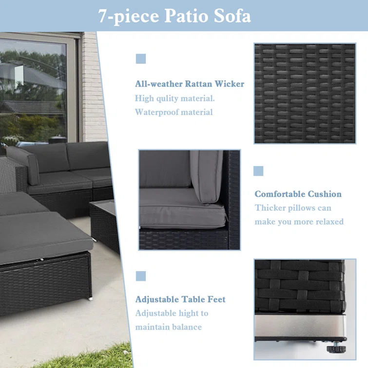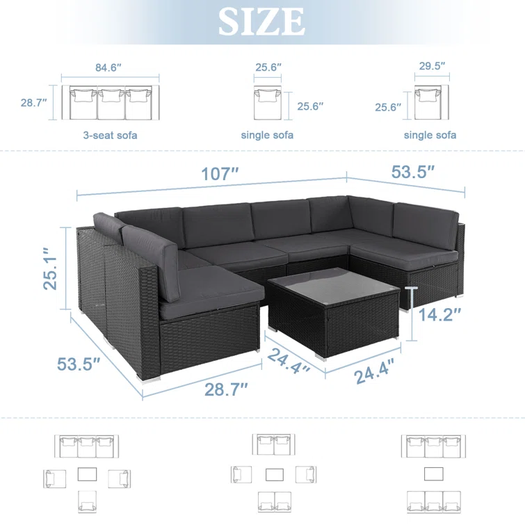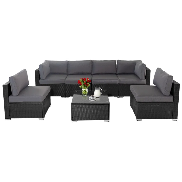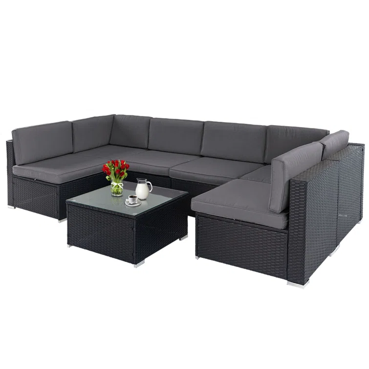 - Outdoor sectional sofa 7 pieces of patio furniture sets come with 2 corner sofas, 4 armless sofas, 1 table with tempered glass top, and thicker cushions. You can change the position and combination of corner sofas, armless sofas, and coffee tables based on your need. It offers a comfortable and relaxing setting for a delightful time when family and friends gather around.