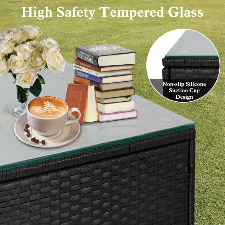 Our outdoor furniture sofa set will let you start with a sofa designed to be the focus of any garden, backyard, poolside, or balcony, which provides stylish and comfortable lounging to have a conversation with your family or friends. Each weather-resistant piece is crafted with a steel frame that's wrapped in PE wicker with woven details for a breezy look, coffee table with durable tempered glass for safety and easy to clean provides a perfect platform for drinks and food.