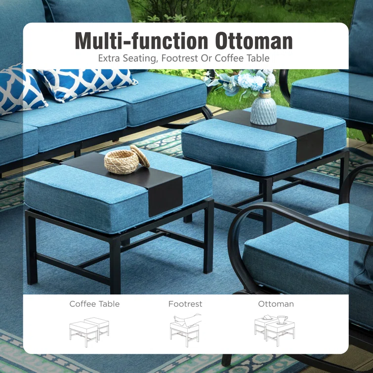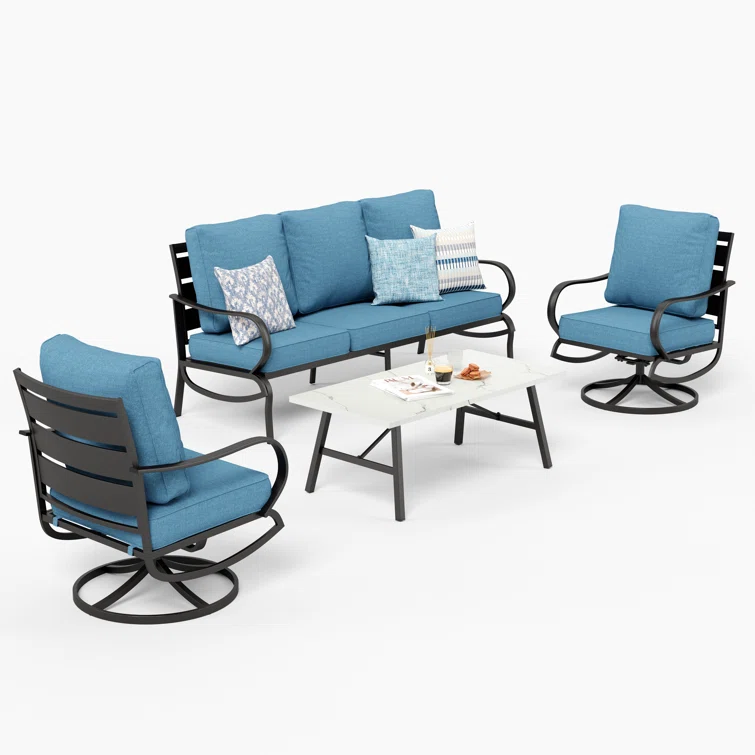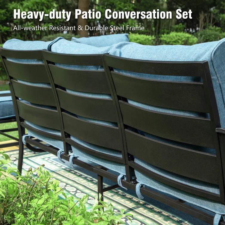 Our outdoor conversation sets can accommodate 5 people. As a quality outdoor furniture set, they take sophistication to the extreme. The sofa is made of a durable powder-coated metal frame that is rust-proof. The sofa cushions feature a 5-inch thick seat cushion with cushion pro technology that is water, oil, and stain repellent. This patio conversation set can be used as balcony furniture, front porch furniture, or lawn furniture. It can provide you with a soft and comfortable riding experience.