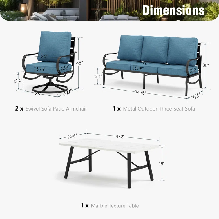 - Elevate Outdoor Relaxation: Redefine outdoor comfort with this thoughtfully curated seating arrangement. From relaxed conversations to tranquil lounging, this set offers an inviting space to savor memorable moments.