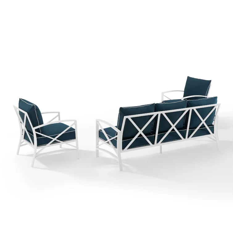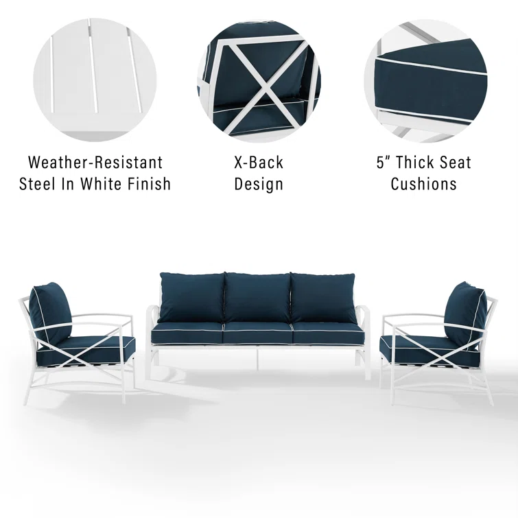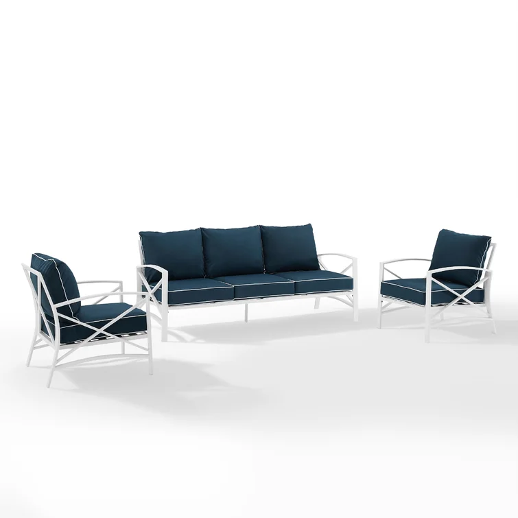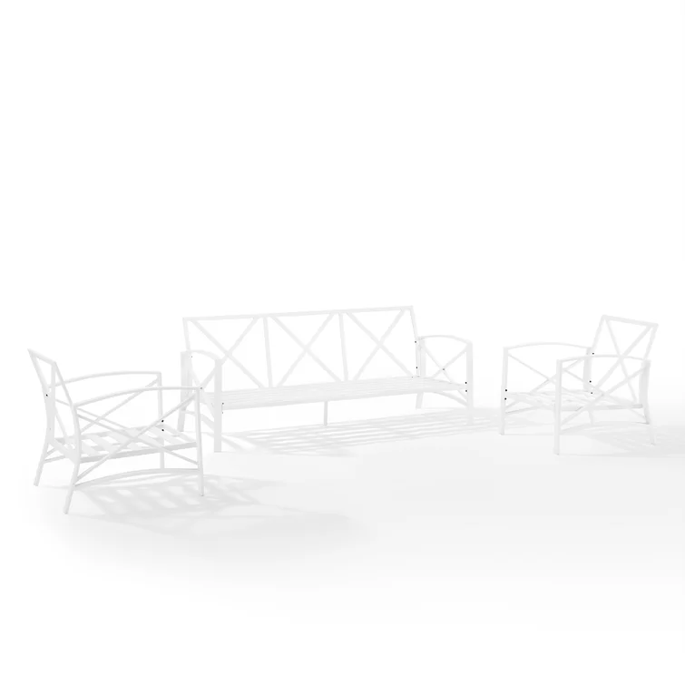 This 3-piece outdoor conversation set has a streamlined, modern look and completes the design of your outdoor seating area. Constructed of weather-resistant metal, the sofa and two chairs have lines that are sleek, not fussy. We love the slightly arched arms and the open, cross-bar sides. This ensemble comes with cushions covered in a polyester-blend fabric for both the sofa and the two chairs — so you’ll be able to relax with family and friends on the first sunny day. Add a couple of accent pillows for an extra pop of color and to make this set even more inviting.