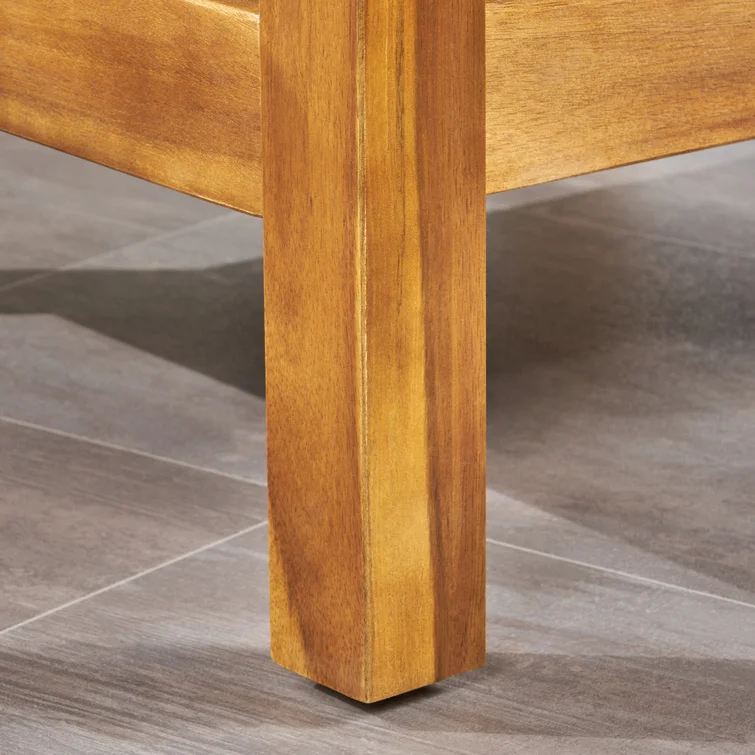 This 3-piece outdoor seating group set instantly creates a classic look with solid wood construction. It includes one sectional sofa, one armchair, and one coffee table, all crafted from solid teak and acacia wood in that signature warm honey-brown teak wood hue. The seating design features clean lines and X-shaped accents on the arms, and they both come with all the cushions you need for comfort and support. We love that the matching coffee table has a low profile to complete the streamlined look of this modern outdoor seating group.