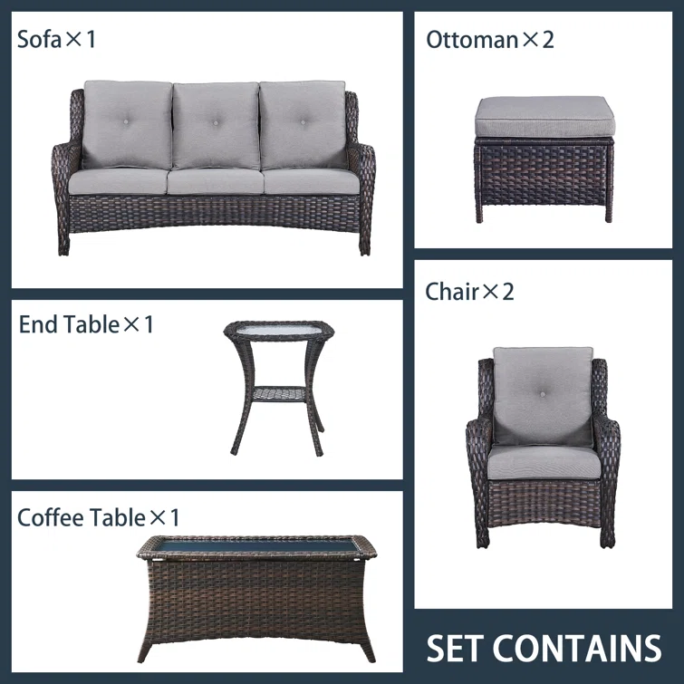 This patio furniture set is a generously proportioned all-weather wicker lounge amenable to modular configuration, giving you the freedom to create a flexible outdoor lounge setup that is perfect for your outdoor living room and garden. All outdoor furniture sets are sturdy yet light enough to move wherever you want, giving you the freedom to adapt to your socializing needs. Sofa and chairs are placed freely around the coffee table to allow for unrestrained conversation.The gently contoured body of the chair and ottoman are woven in natural-colored textured wicker and include luxurious full-length all-weather cushions, leaving nothing to distract you from enjoying your leisure time.