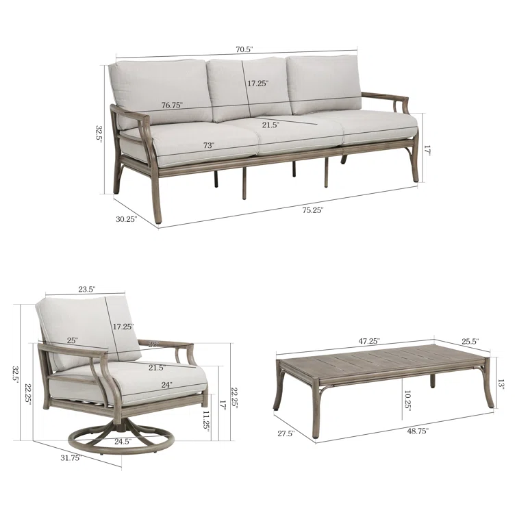 This well made conversation set includes a 3-seater sofa, two swivel chairs, and a coffee table, all featuring a durable aluminum frame with a wood grain texture. Low-maintenance and built to last, this seating group is a perfect blend of style and functionality. The sofa and swivel chairs are equipped with Olefin cushions that are not only comfortable but also waterproof and machine washable, ensuring easy care and long-lasting use. The elegant curved armrests of the club chairs add a touch of sophistication to the design, while the 360-degree swivel feature enhances flexibility and convenience. The coffee table boasts a stylish lattice top design, complemented by gently curved legs crafted from round tubing for added stability and visual appeal. Elevate your outdoor living space with this 4-Piece Seating Group, perfect for relaxing, entertaining, and enjoying the great outdoors in style.