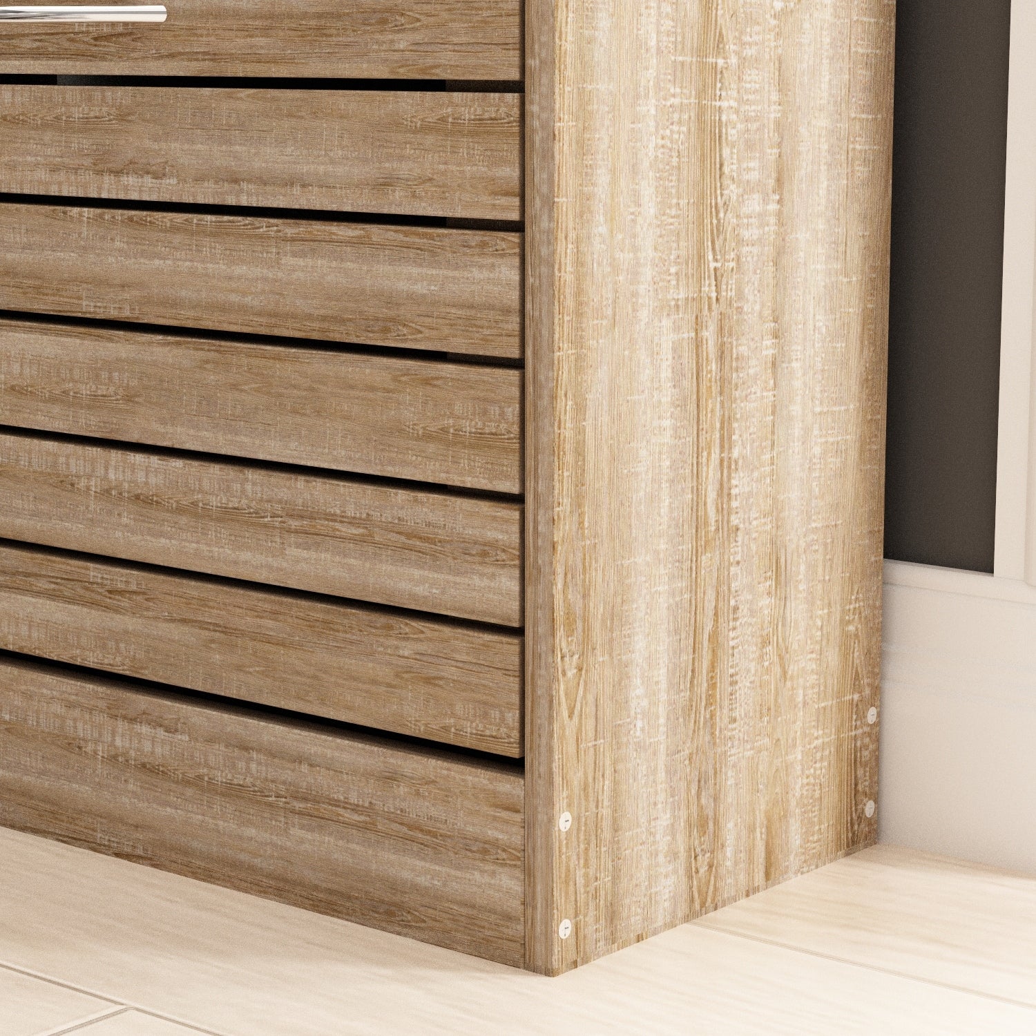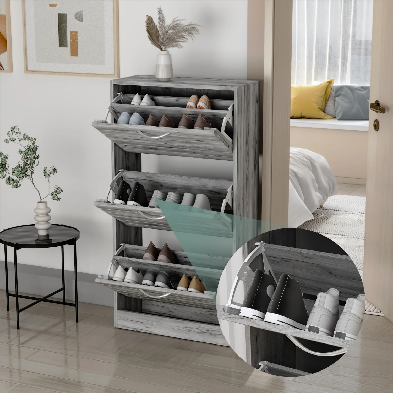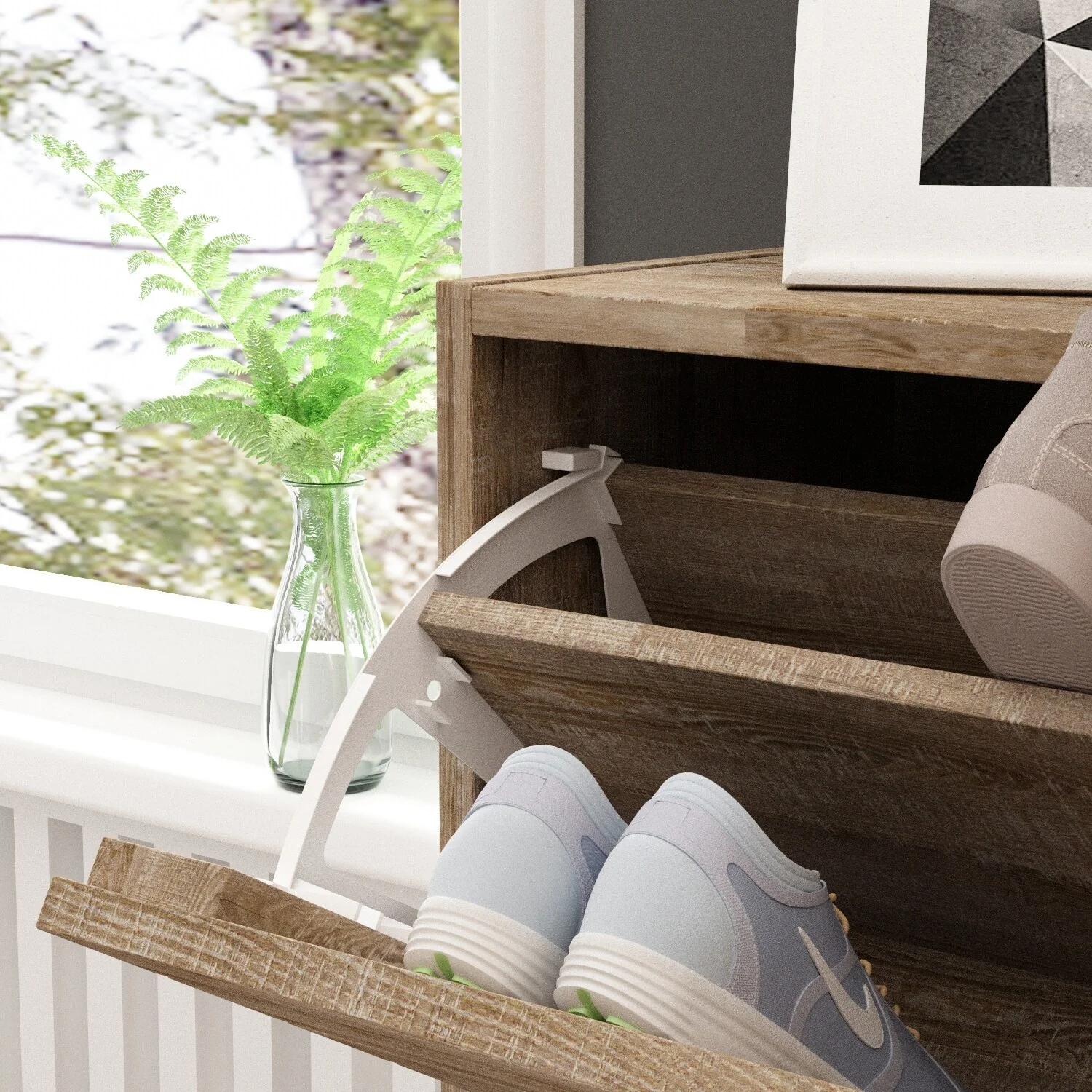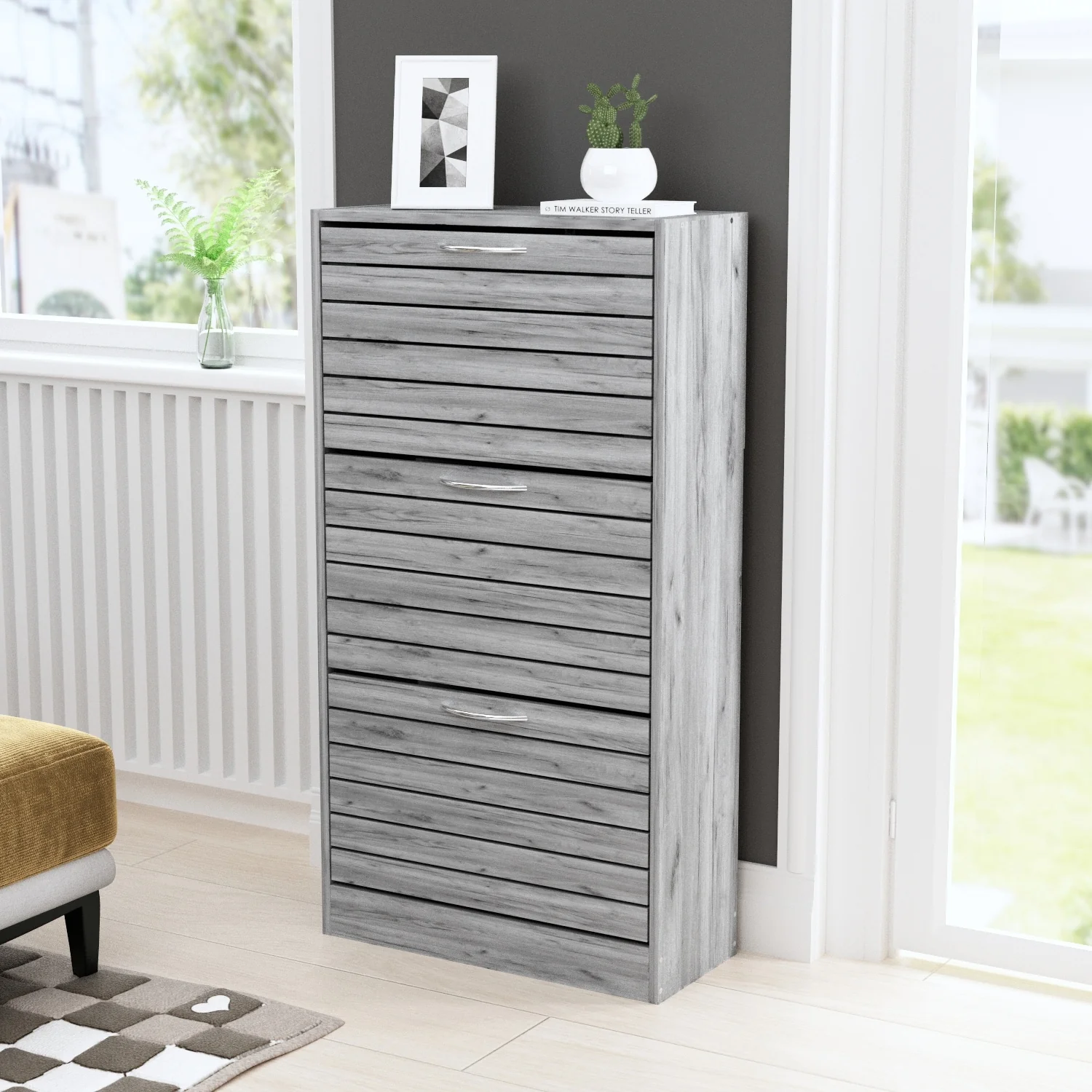Keep your shoes organized and easy to find with this space-saving shoe cabinet. Made of high-quality wood and finished with scratch-resistant MDF, this cabinet features three compartments with adjustable dividers to accommodate sneakers, heels, or dress shoes of all sizes. Its sloping doors provide easy access and save floor space, making it perfect for entryways, hallways, or bedroom closets. Say goodbye to messy shoes and hello to organized bliss with this smart shoe storage solution.