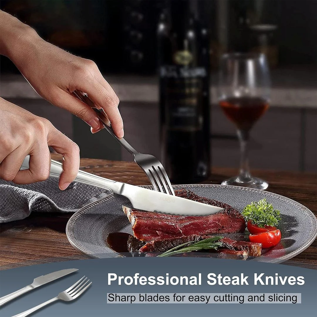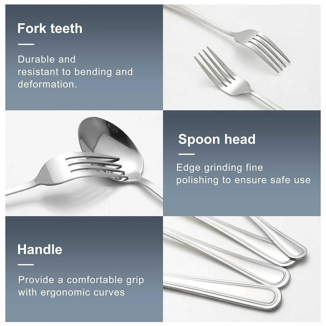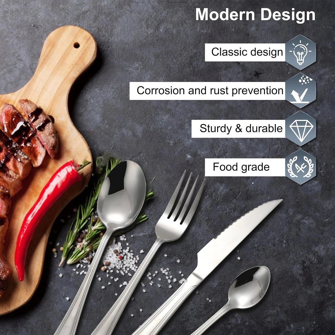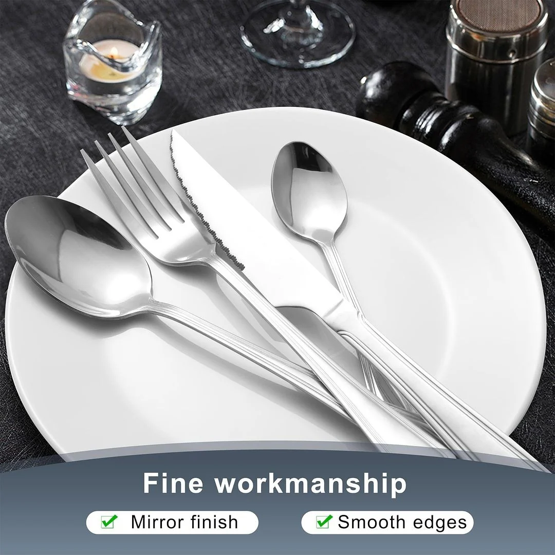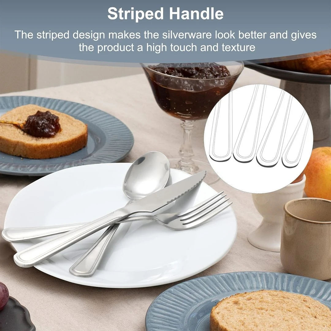 Elevate your dining experience with our 24-piece stainless steel silverware set. Crafted from high-quality polished stainless steel, this set exudes elegance and durability. The classic design and ergonomic handles ensure comfort and style with every use. Dishwasher safe for hassle-free cleaning. Packaged in a stylish gift box, perfect for any occasion.