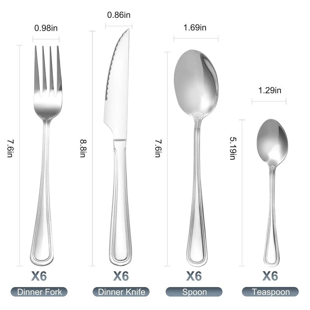 - Included: 6 dinner forks, 6 dinner spoons, 6 tea spoons, 6 dinner knives