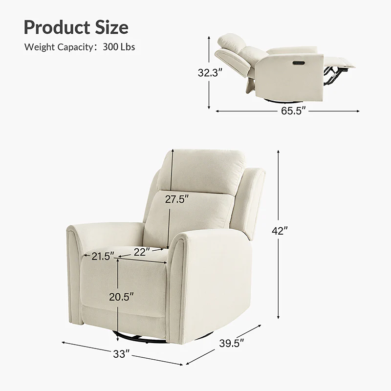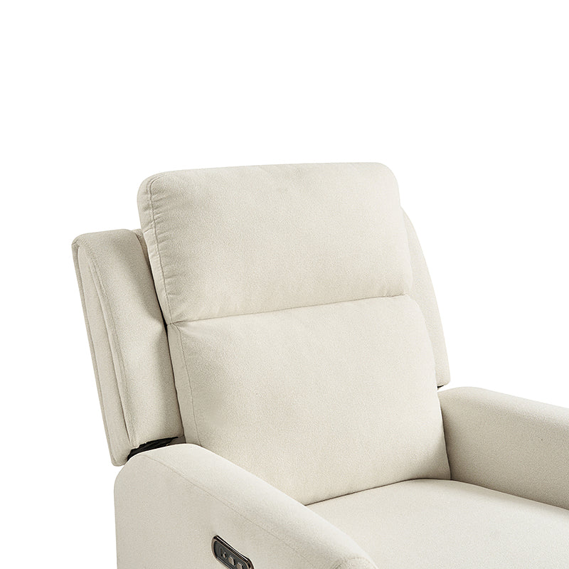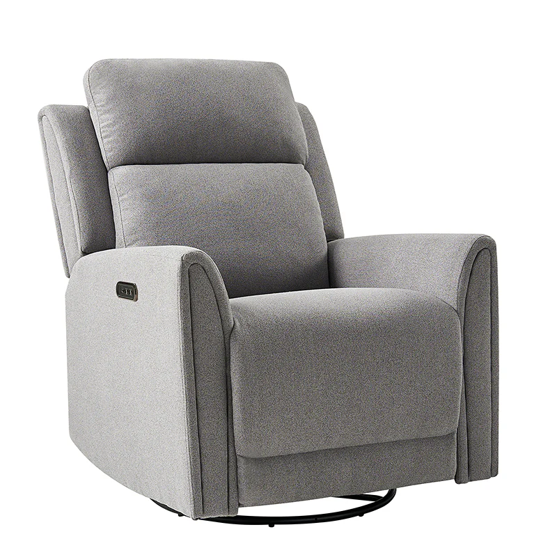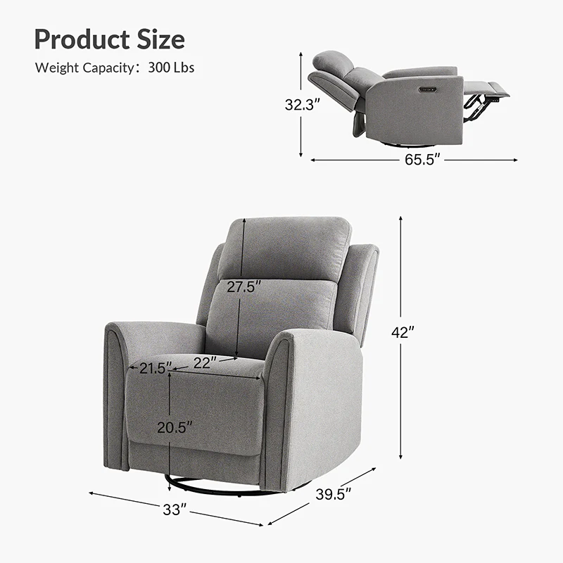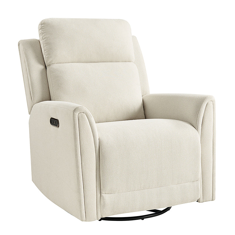 Suitable for your living room, bedroom, or study, the modern swivel and rocking power recliner offers comfort for your leisure time. With its 360-degree swivel and rocking design, you can easily adjust your position to find the angle for reading, watching TV, or simply unwinding after a long day. The convenient one-touch reset mechanism allows you to effortlessly adjust your position, while the adjustable headrest provides personalized comfort and support. Stay connected and powered up with the built-in USB and type-c ports, ensuring your devices are always within reach. Crafted with a soft-touch fabric in elegant shades of white or grey, the contemporary swivel recliner seamlessly blends style with functionality. Whether unwinding after a long day or catching up on your favorite book, this transitional style power recliner provides a spot to relax and recharge.