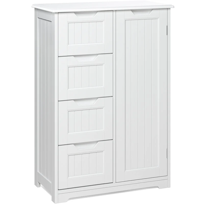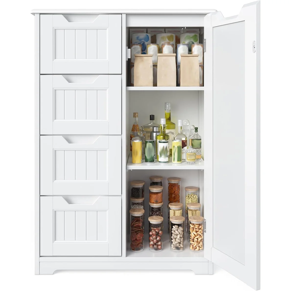 - This durable floor-standing cabinet is designed with four drawers and a cabinet with three layers of storage space, and is equipped with two partitions that can be adjusted to different heights, providing enough storage space to store items of different sizes to meet the different needs of everyone.