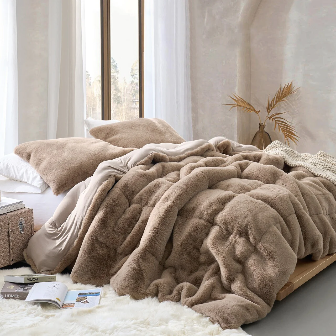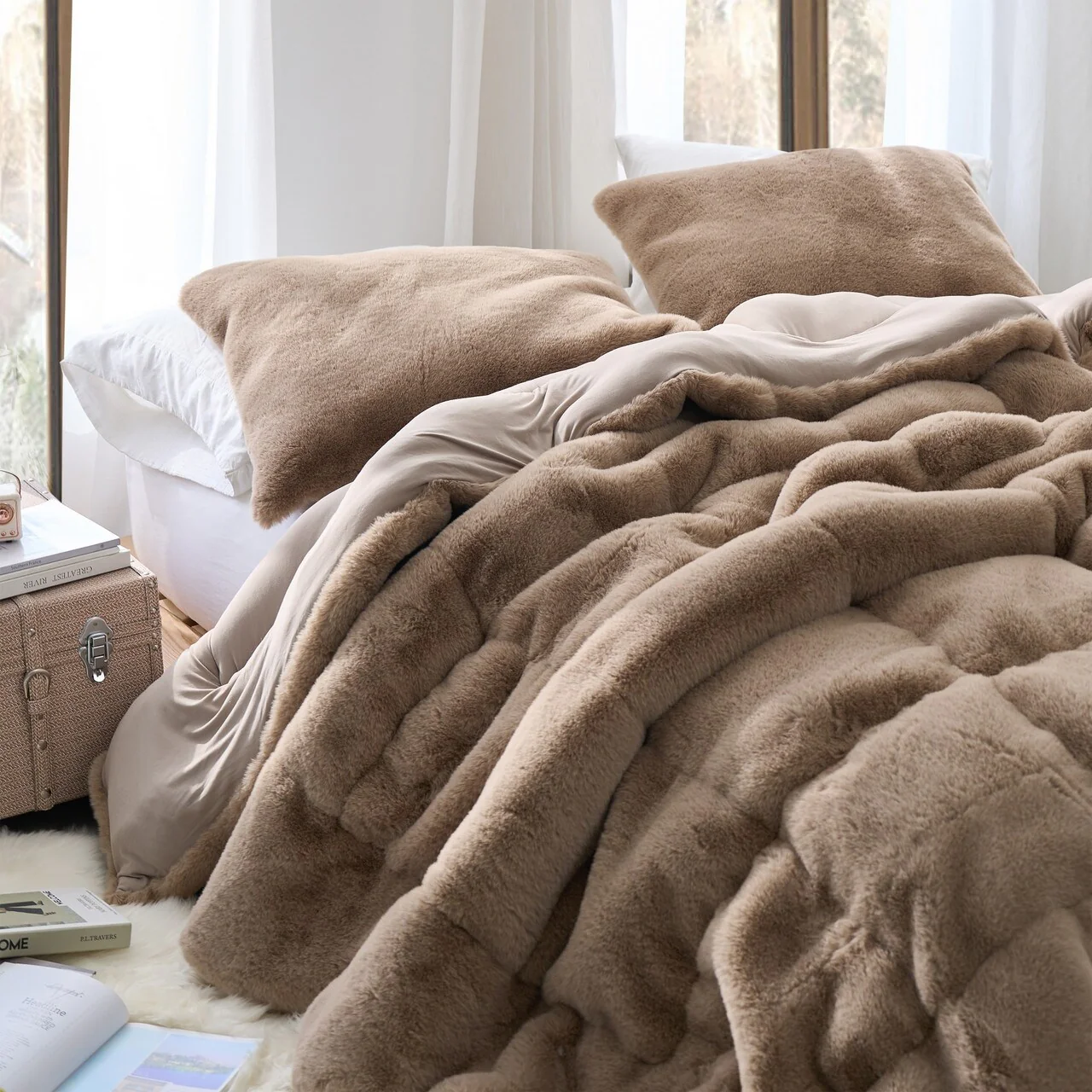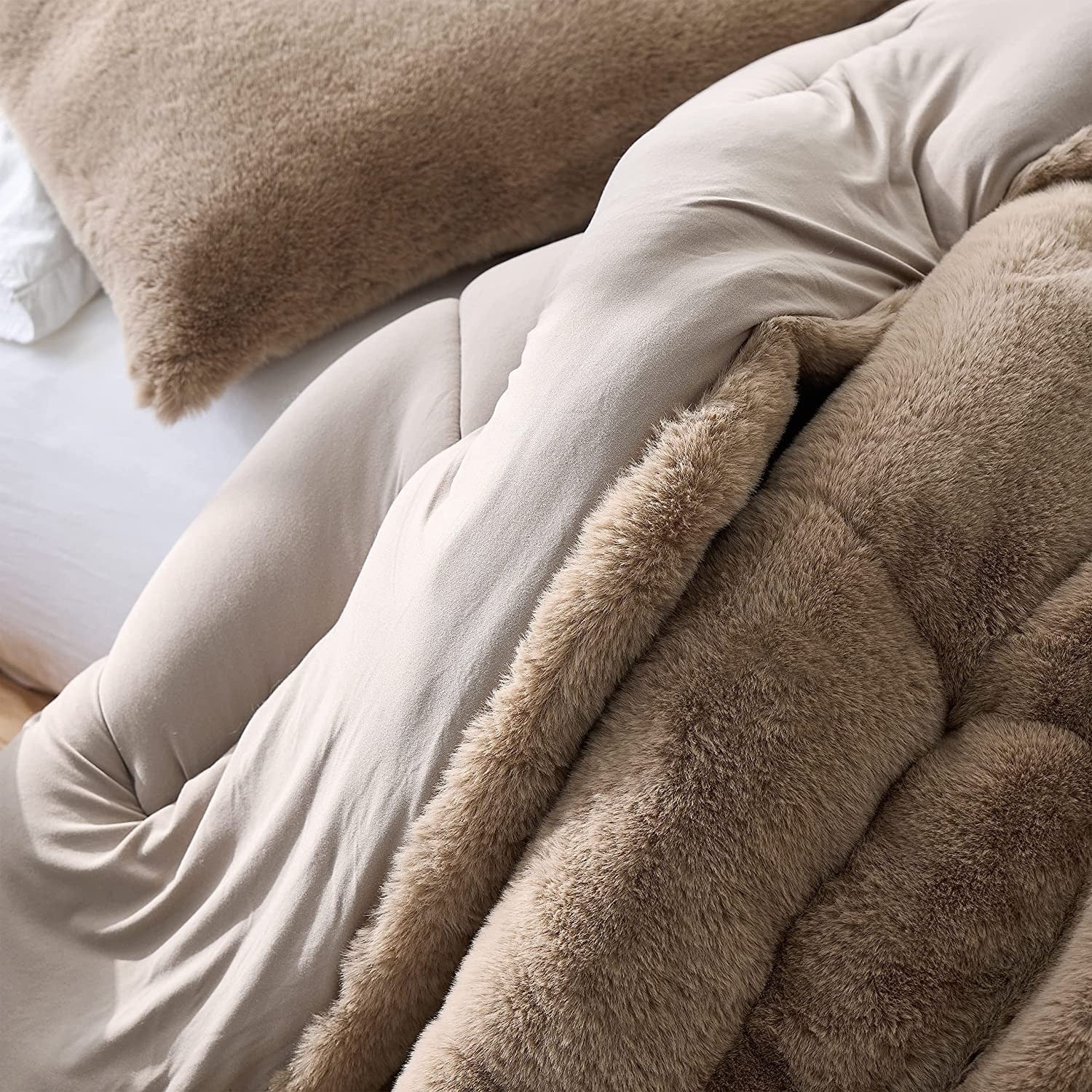 You may be wondering what makes this oversized Twin XL, Queen, or King comforter so cozy, especially compared to our other Coma Inducer? luxury bedding essentials. Inspired by high-end athleisure brands, our signature buttery-smooth Yoga Pants material covers the reverse side of this neutral Twin XL, Queen, or King bedding essential, providing a uniquely soft touch that is sure to exceed your expectations. But it's the fluffy Chunky Bunny? faux fur on the front side that makes this plush Twin XL, Queen, or King designer comforter truly hard to resist! Elevate your bedding experience to new levels of relaxation with this luxurious Twin XL, Queen, or King oversized comforter.