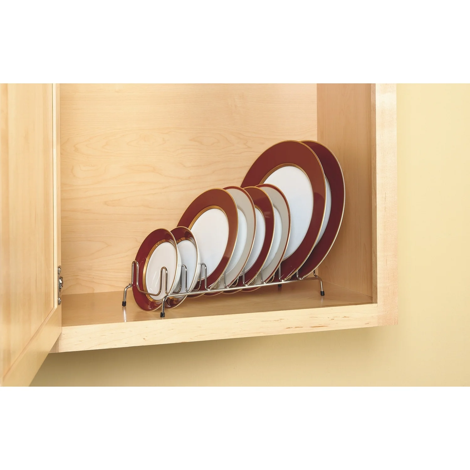 Restore order to your cabinets or work surfaces with the ClosetMaid Lid and Plate Organizer. With 8 slots to hold plates, dishes or pan lids, this rack can be added to any surface or cabinet for extra organization. Made from steel with an attractive and clean chrome finish allows for clean looking organization. No assembly or installation required. Item stands free on surface and includes rubber feet to prevent scratches to surfaces.