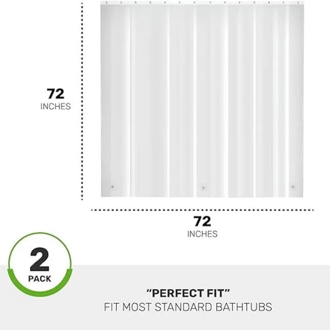 - STANDARD SIZE: Our 2 Peck Set Shower Liners Fit Any Standard Size Shower or Tub, Whether You Have a Straight or Curved Shower Rod! Three Heavy Duty Magnets on The Bottom Keep the Curtain in Place- And Away from Your Body. Features 12 Rust-Proof Metal Grommets and a Reinforced Header That Prevents Tearing and Ensures Long-Term Functionality.