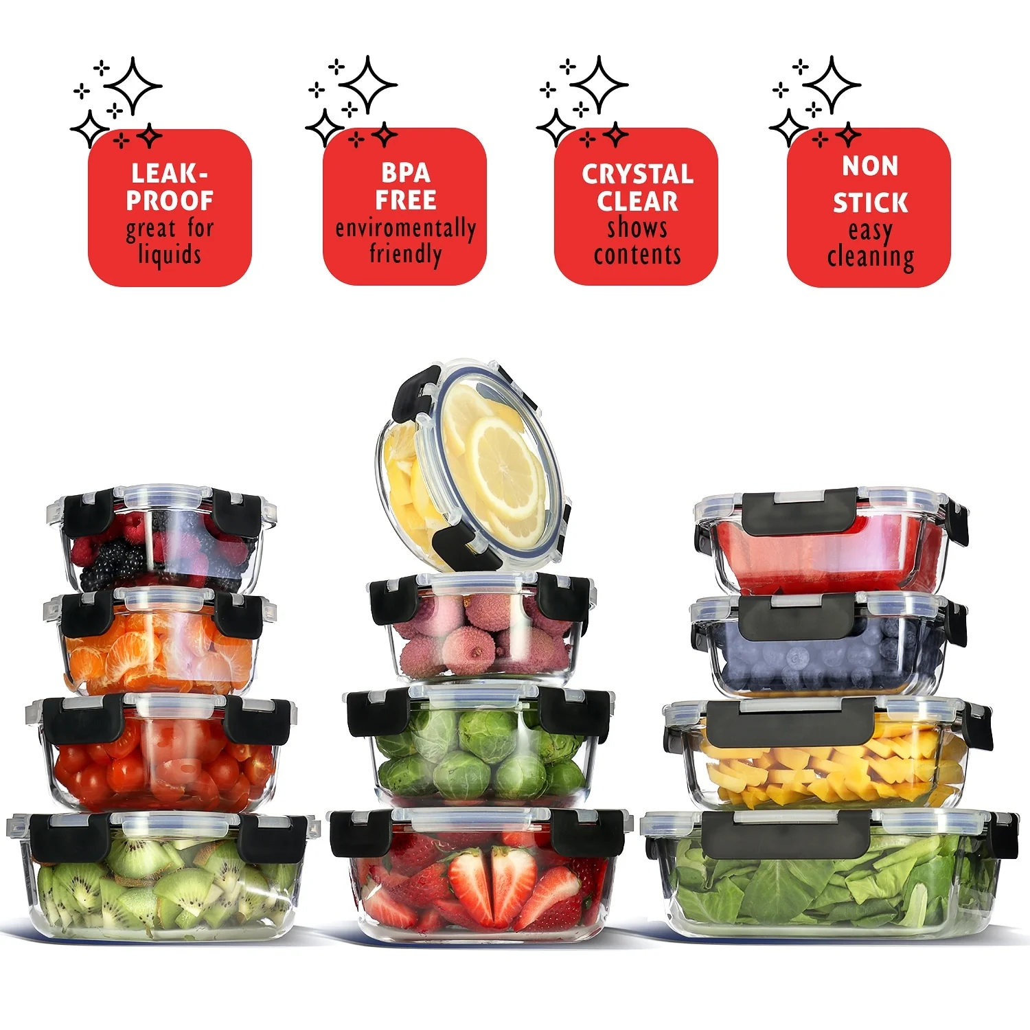 Enjoy organized, hassle-free food storage with Eatex��s 12-24 Pack Food Storage Containers, which includes containers with lids in assorted shapes and sizes. Made of durable borosilicate glass that��s highly resistant to thermal shock, these containers can go from freezer to oven without breaking, making them perfect for meal prep or storing leftovers. The high-quality plastic lids include secure latches and a silicone ring for an airtight, leakproof seal. Designed to fit your busy lifestyle, these versatile containers are fridge and freezer-safe as well as oven, microwave, and dishwasher-safe (containers only).�