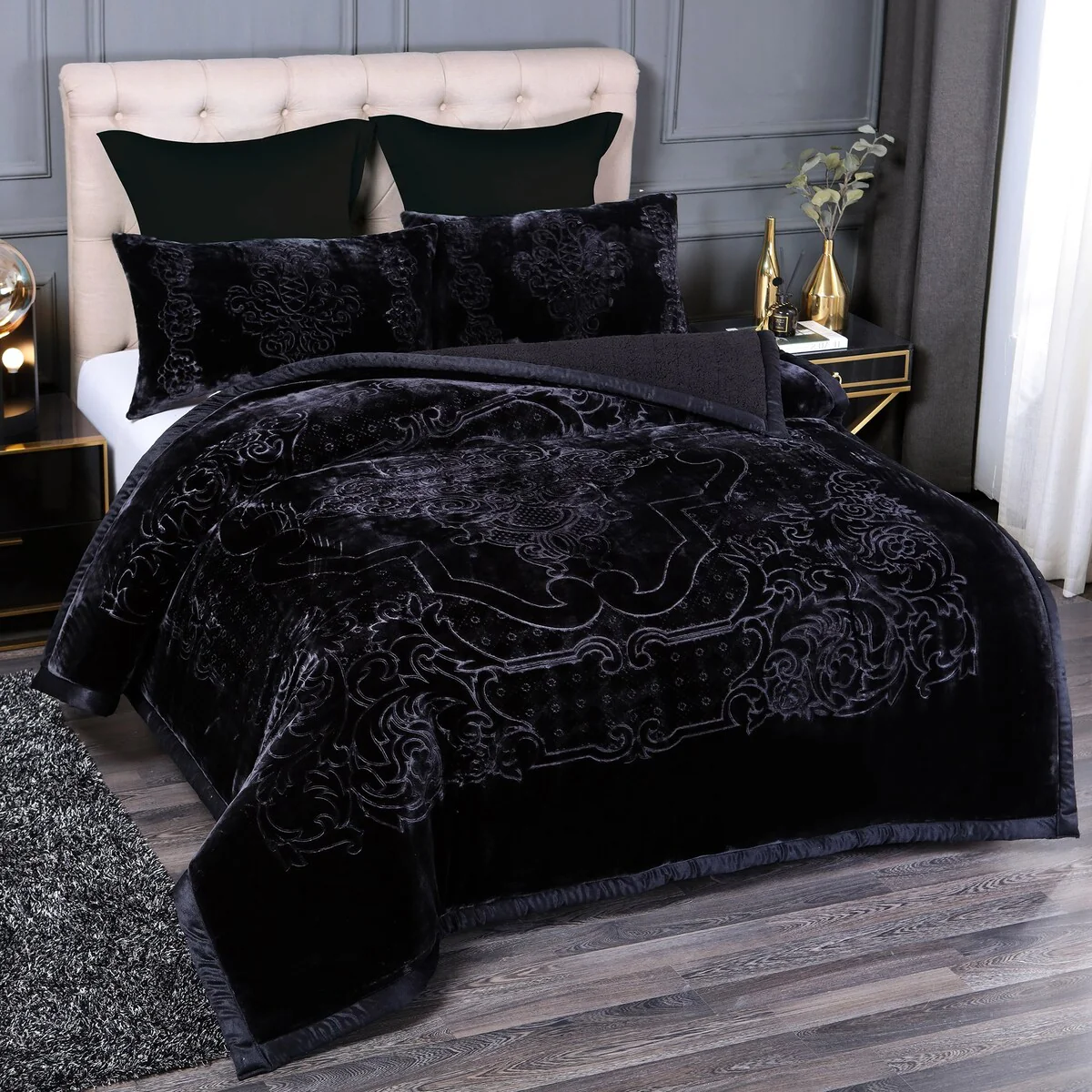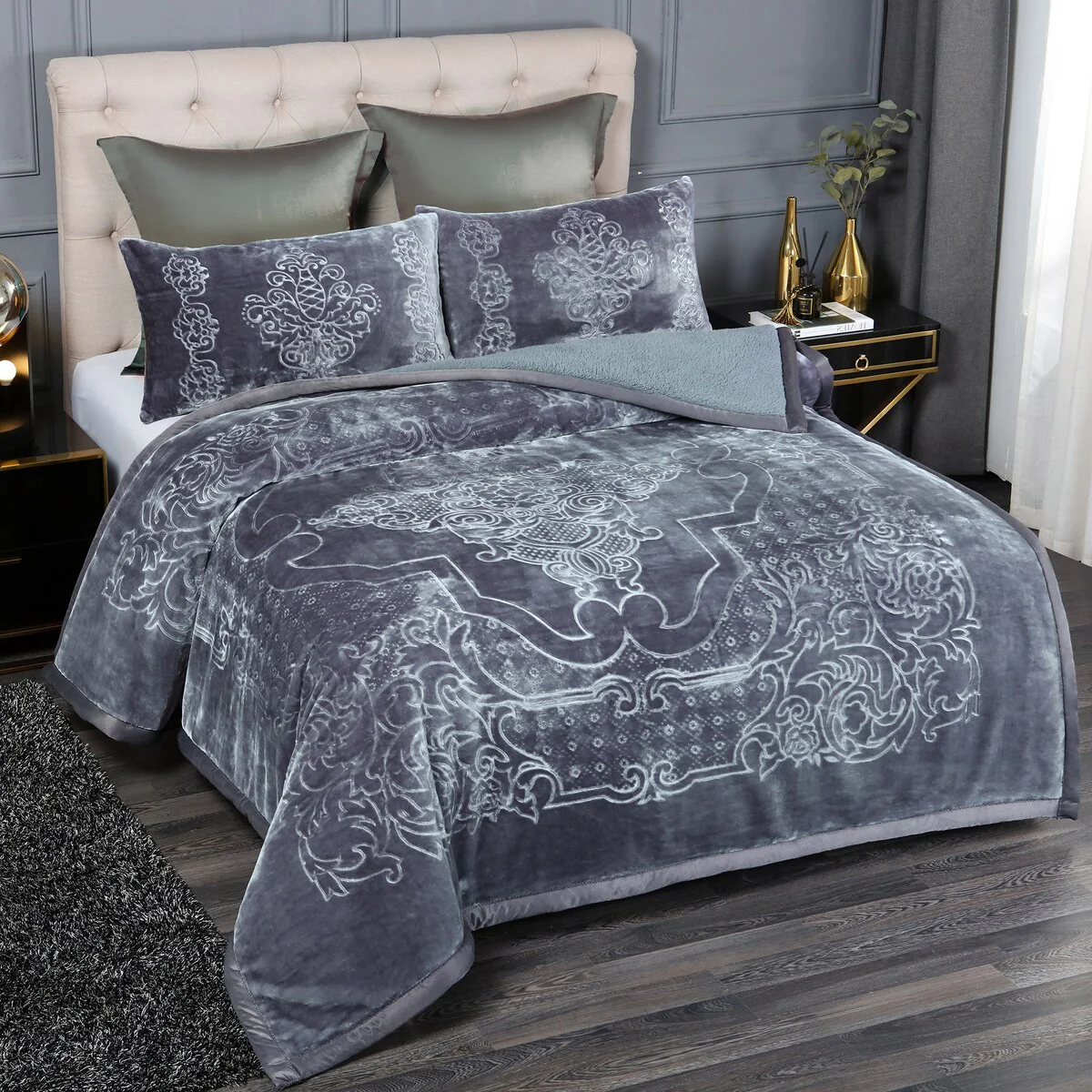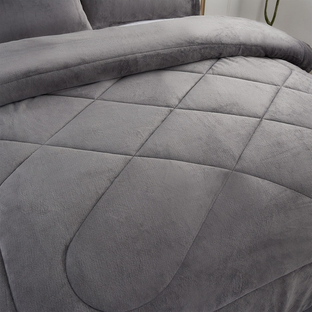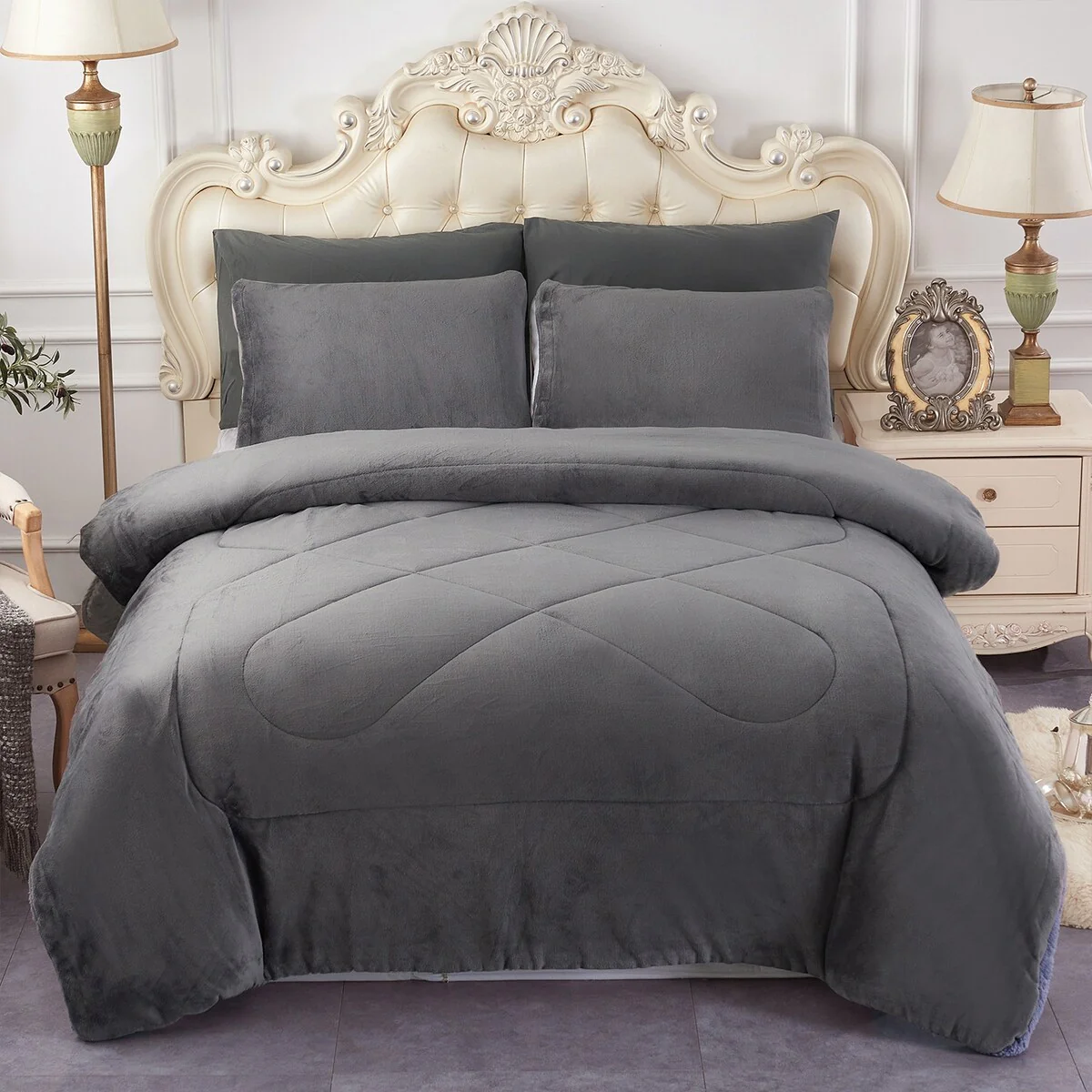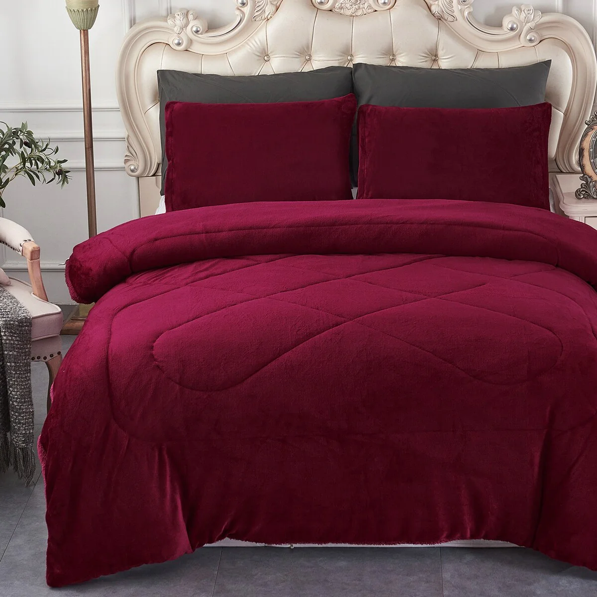 Snuggle up in cozy comfort with our Fleece/Sherpa Down Alternative 3-piece Comforter Set. This set features a flannel surface and Sherpa backing, making it perfect for cold nights. The down alternative fill ensures warmth without the weight of traditional down. With its modern and contemporary style, decorative stitching, and reversible design, this comforter set is sure to enhance any bedroom decor. Machine washable for easy care.