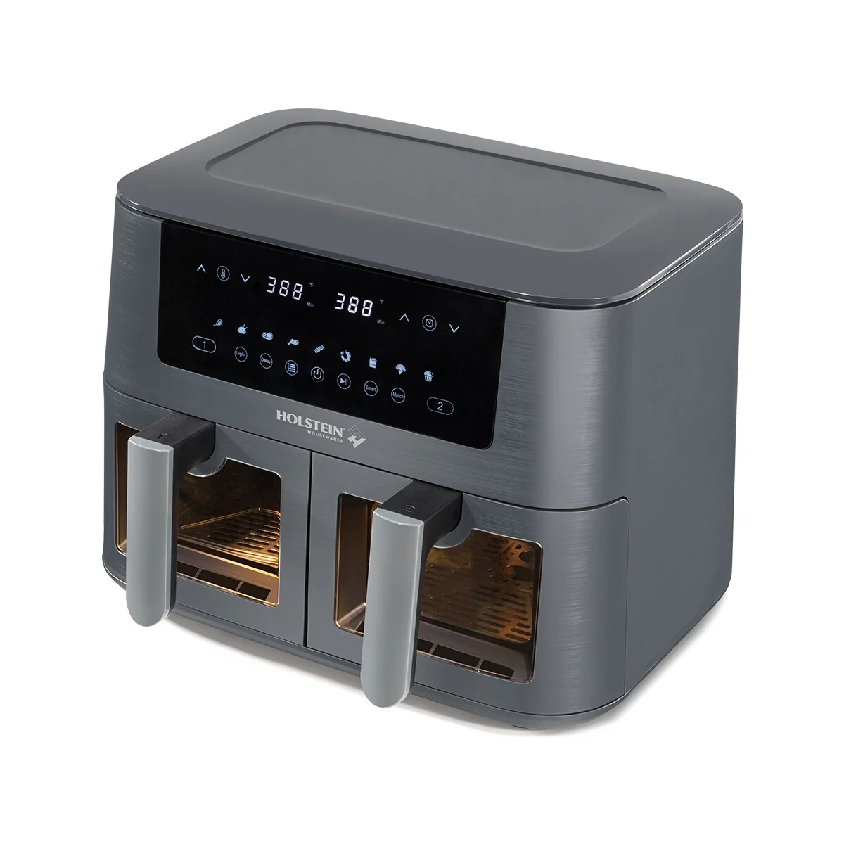 With Holstein Housewares 8.4 QT Dual Basket Digital Air Fryer, savor your favorite dishes with less or without oil and still enjoy that delicious taste! Its Air Technology cooks food by circulating hot air in all directions, ensuring swift and uniform cooking. It features two 4.2 QT baskets with independent controls, allowing you to prepare diverse recipes simultaneously for a complete meal! Keep an eye on your creations through its viewing windows, and its generous capacity makes it perfect for cooking family and friends meals. Simply adjust the auto shut-off timer, temperature settings and cook! This versatile appliance is a must-have at home, enabling you to fry, bake, grill, and roast healthier recipes. Be creative and try your favorite recipes in just one appliance!