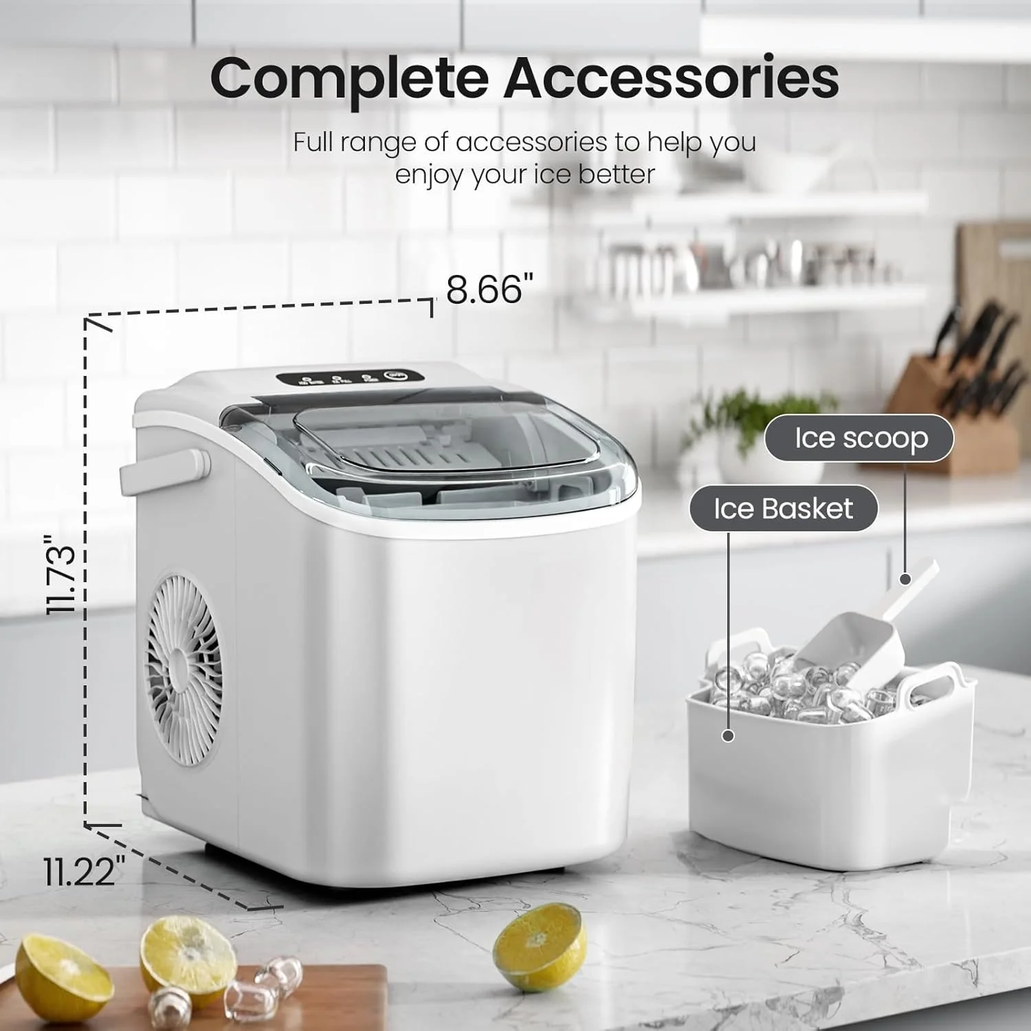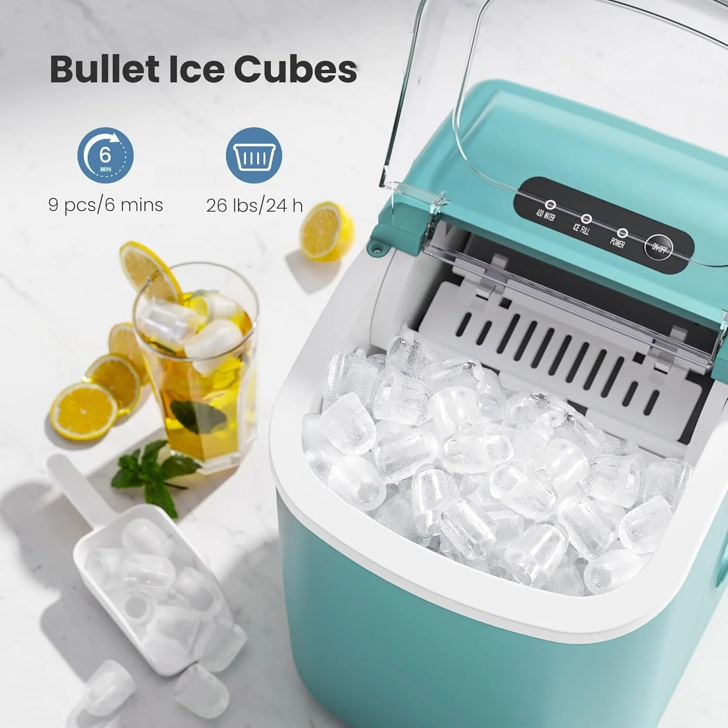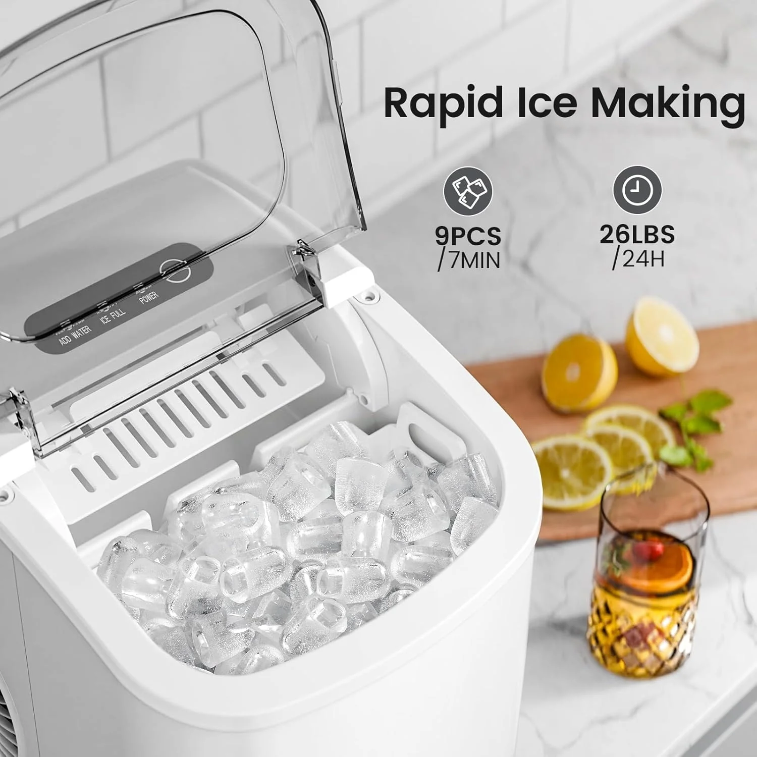 Get fresh ice whenever you want with the efficient and low noise Portable Ice Maker Machine. Equipped with R600a high-quality compressor, this tabletop ice maker produces approximately 9 bullet-shaped ice cubes in just 6-13 minutes and can generate around 26 lbs of ice cubes in 24 hours. Its portable design, with a carrying handle, allows you to take it anywhere you want. The ice machine is ideal for many places, with its compact design of 8.7 x 11.6 x 11.4 inches. The machine features a transparent lid, which allows you to see the ice-making process at all times. With its simple and clean control panel, you get fresh ice cubes for you and your family timely. The self-cleaning function helps remove harmful substances and prolong the service life of the machine.