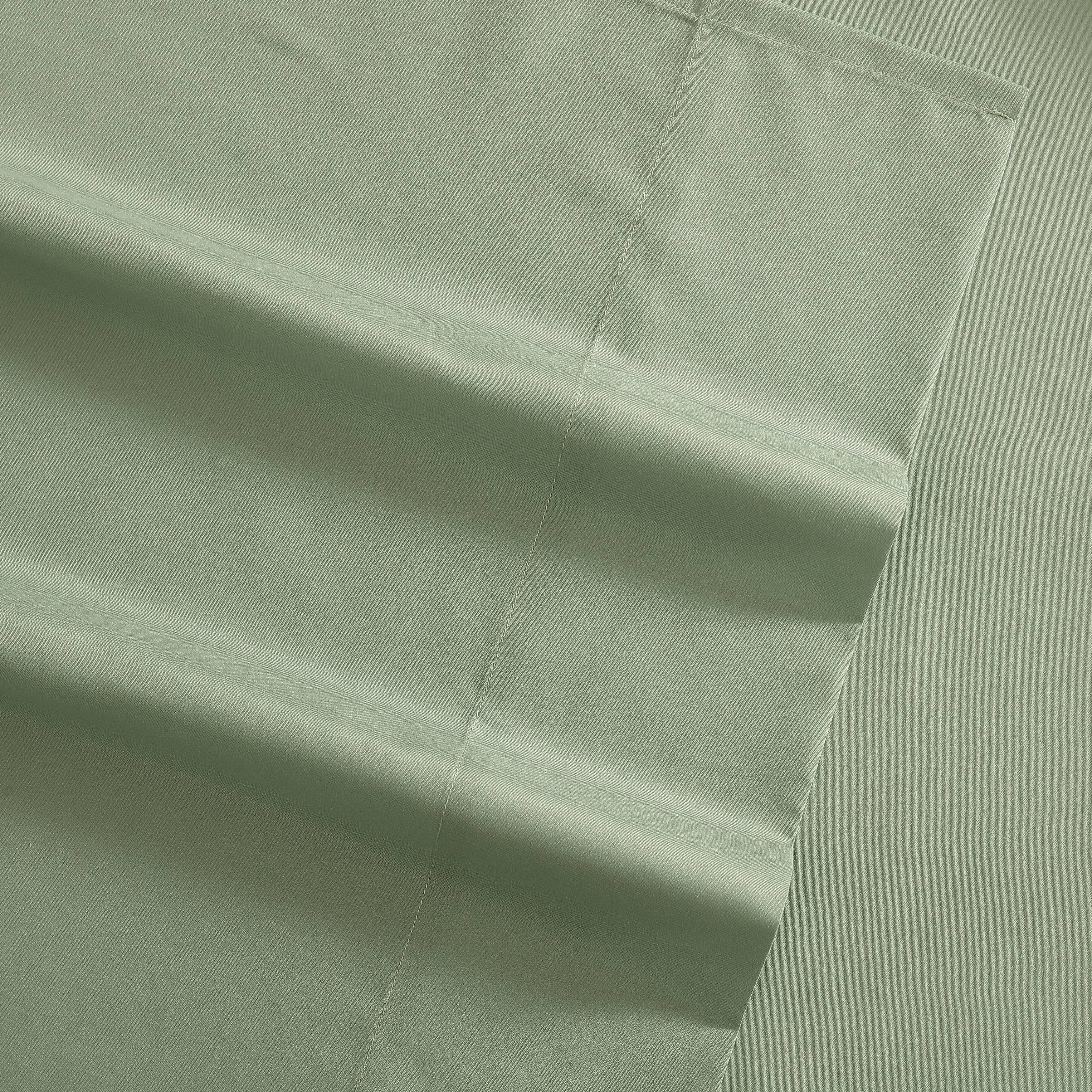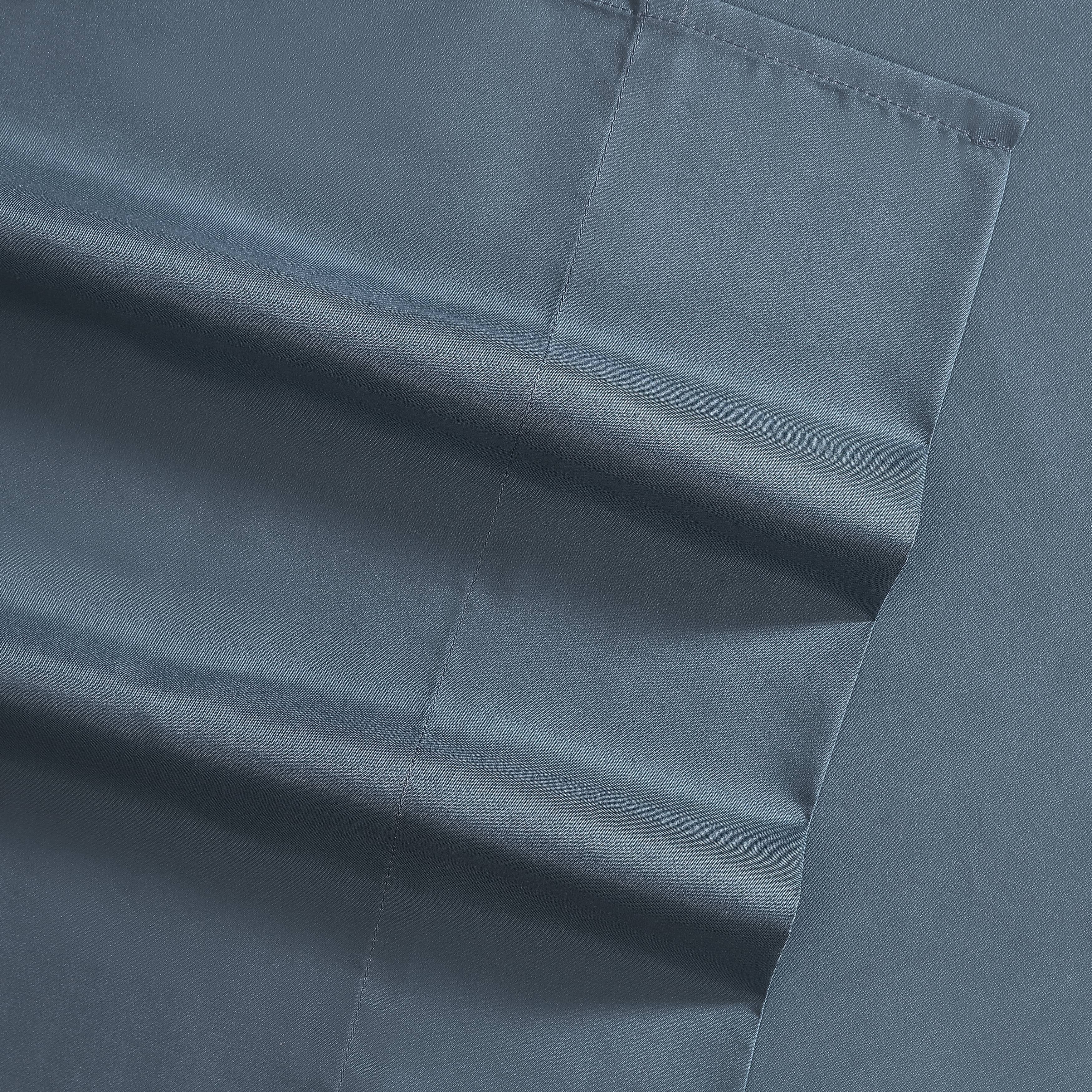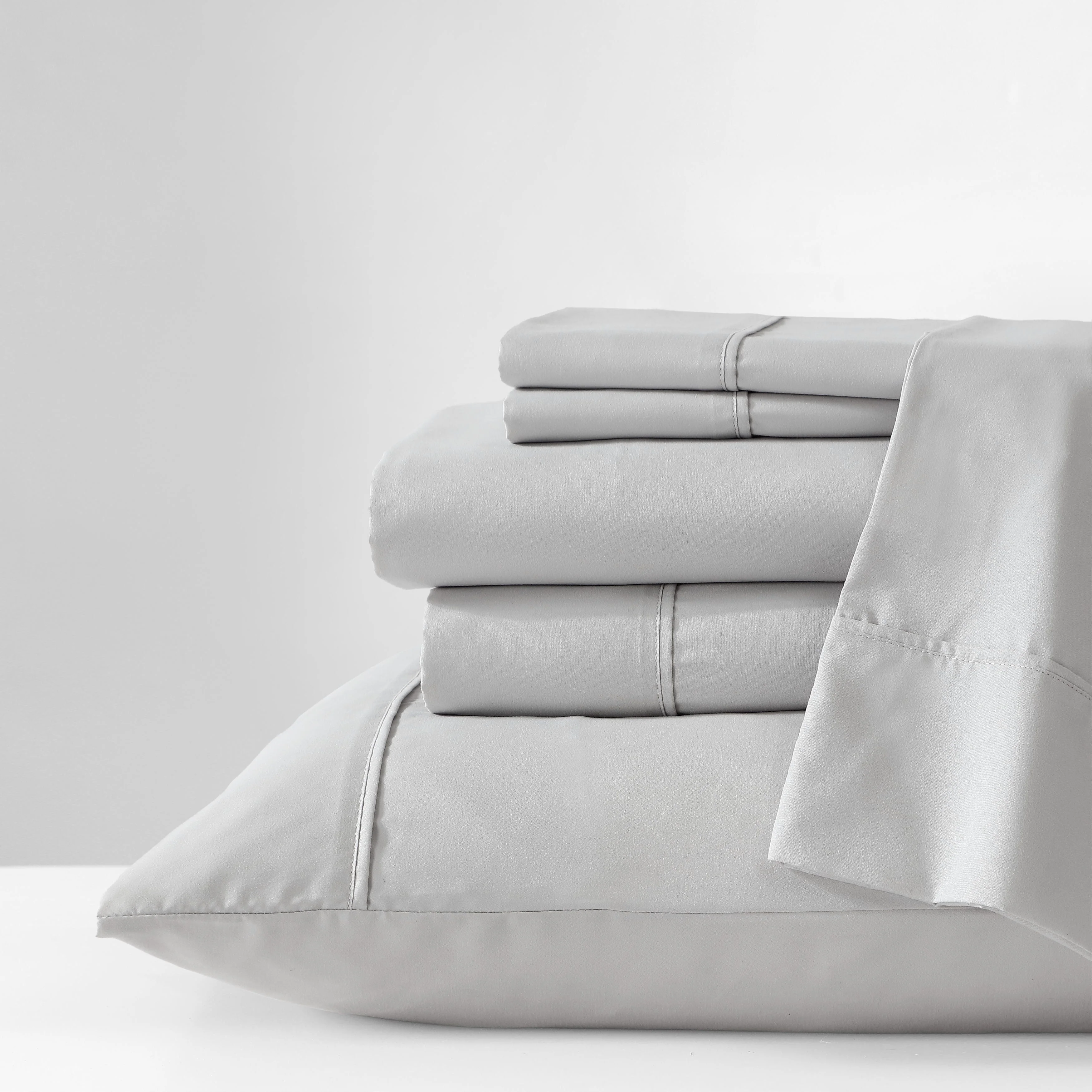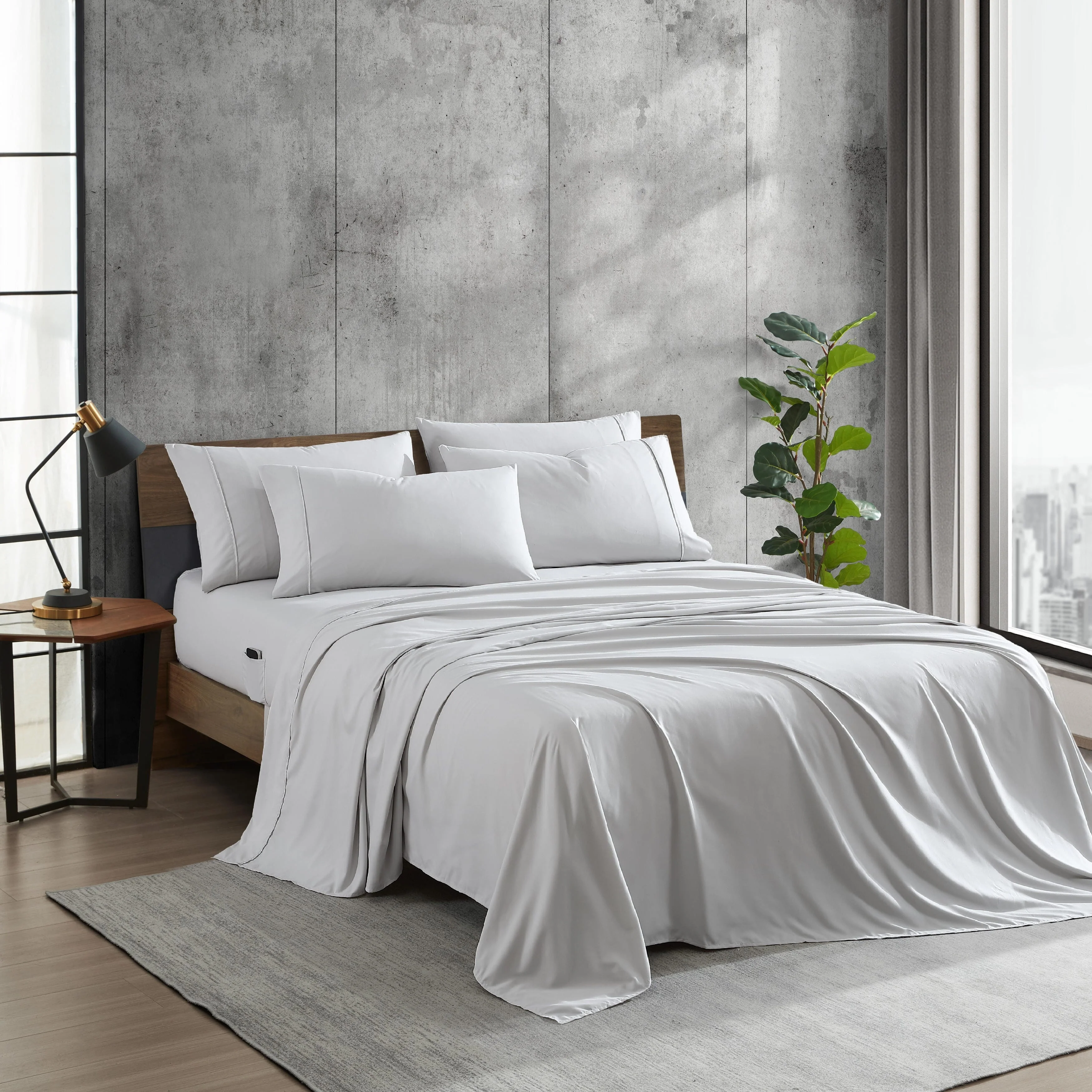 Meet the Solution Sheet from Kenneth Cole - the only sheet you'll ever need. Sustainably made using 100% recycled polyester and Oeko-tex certified, this stylish solid sheet set is the perfect update to any home. The 6-piece sheet set includes one fitted sheet, one flat sheet and four pillowcases (twin size includes two pillowcases). The fitted sheet features all around exposed elastic and is finished with Kenneth Cole's iconic white jacquard logo. This set is benzoyl peroxide resistant, with both a cooling and wrinkle resistant finishes. Fitted sheet features long and short labels for easy on, easy off. Set is machine washable for easy care and available in four solid colors.
