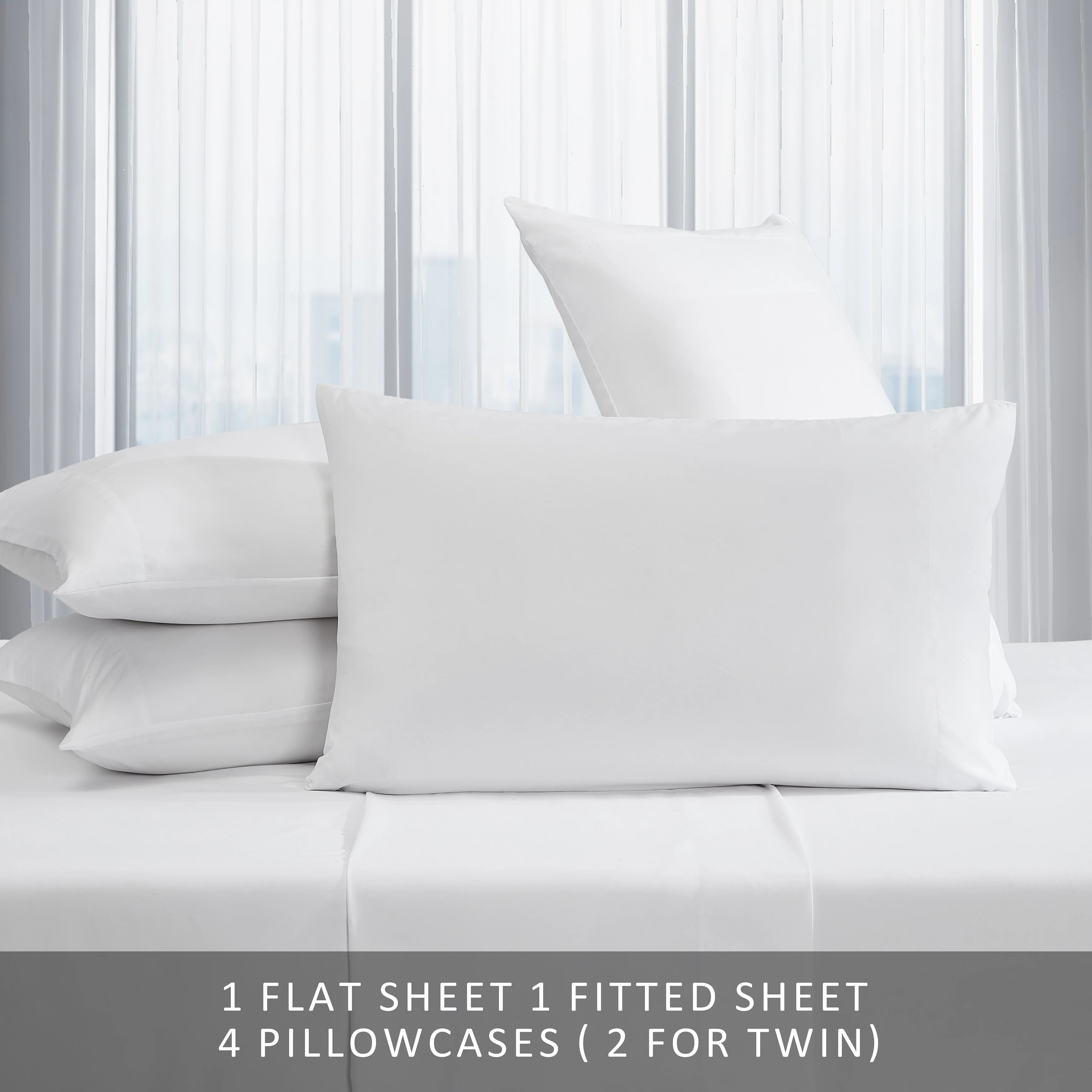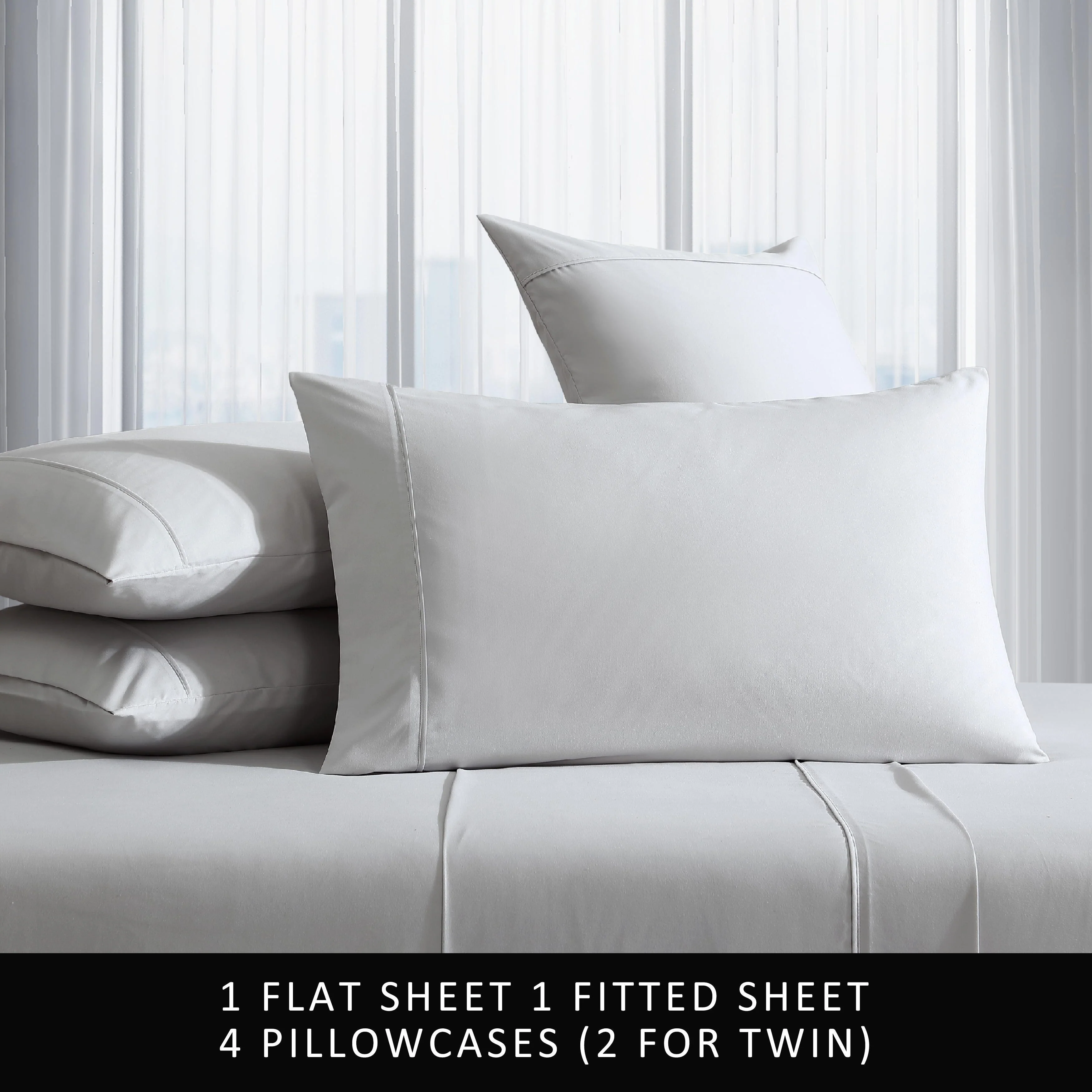Full Sheet Set includes: One flat sheet (96"L x 81"W), one fitted sheet (75"L x 54"W) and four standard pillowcases (20"L x 30"W)
