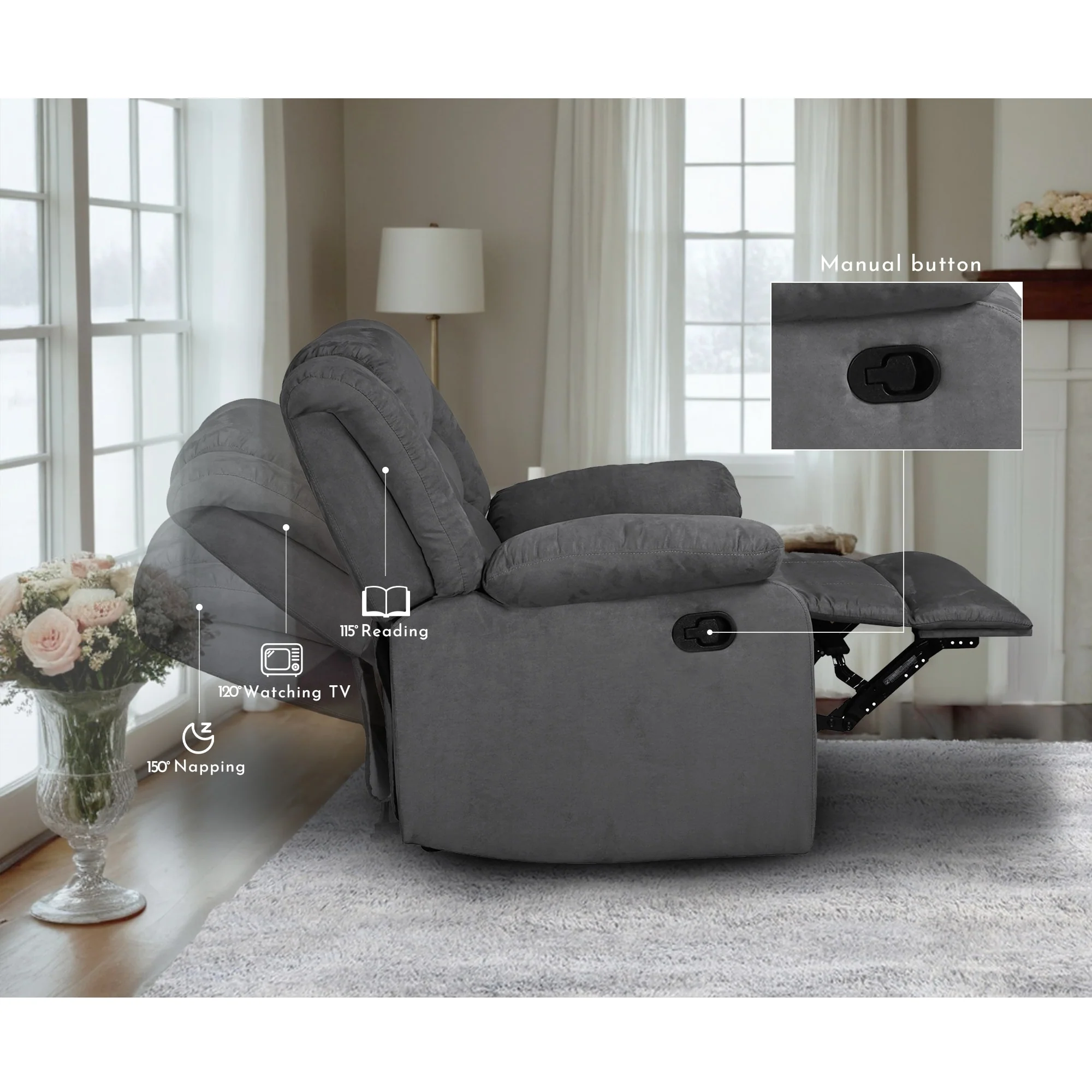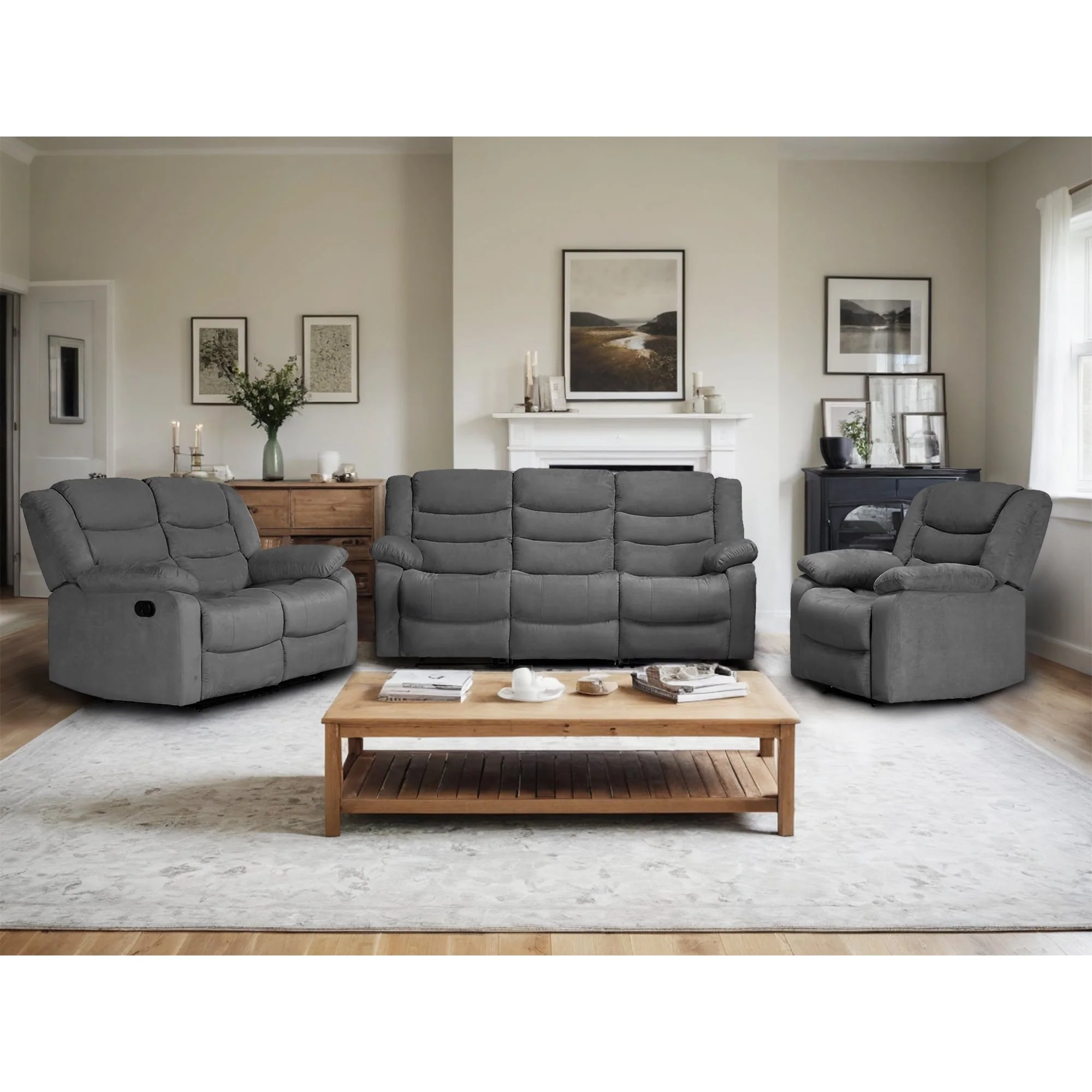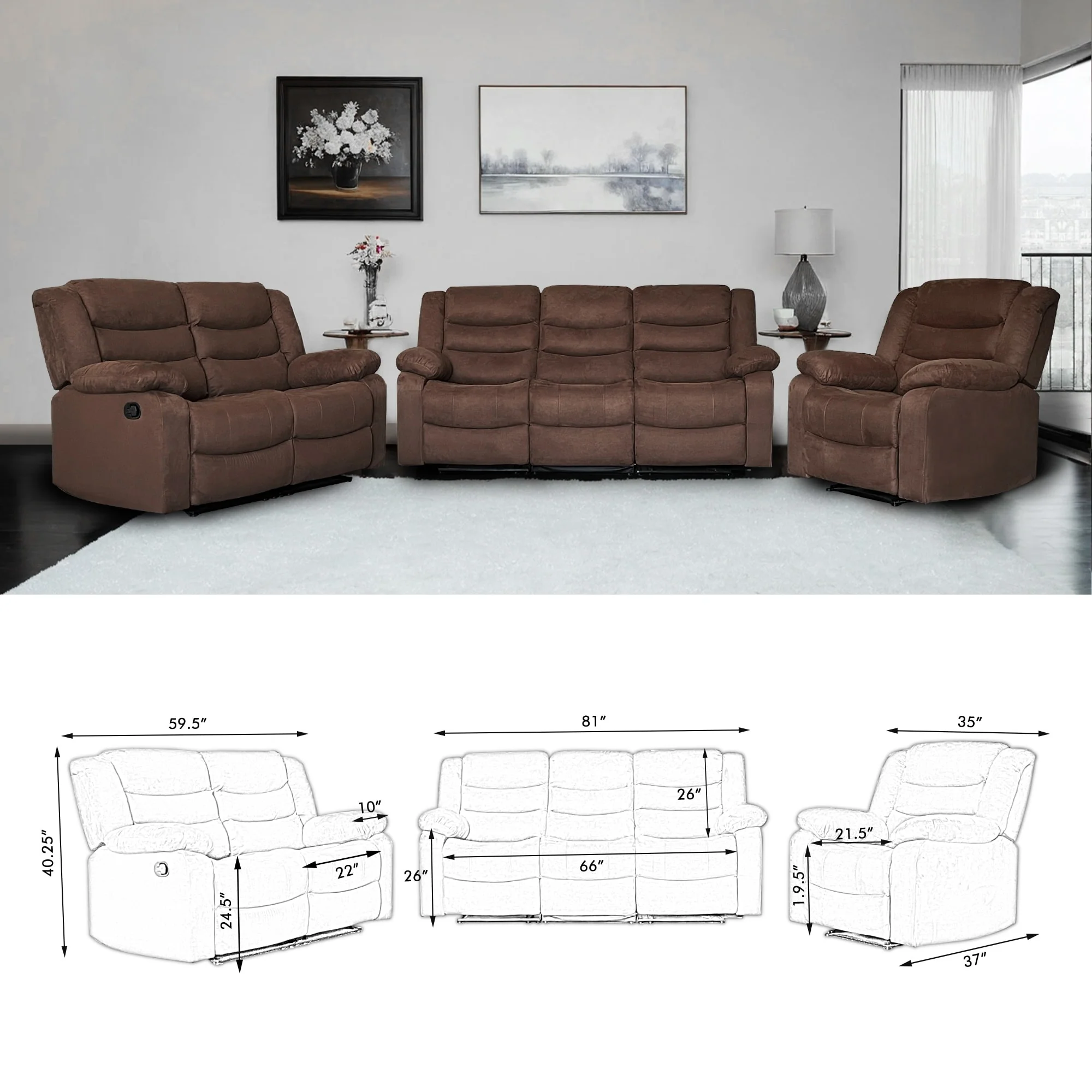 Experience the ultimate indulgence with our manual recliner sofa set, offering exceptional value. This sleek design allows you to unwind and adjust your position for premium relaxation. Crafted with luxurious suede upholstery, the sofa features cozy high-performance cushions filled with supportive innerspring foam. The distinctive stitching adds a touch of elegance to create a space you won't want to leave anytime soon.�