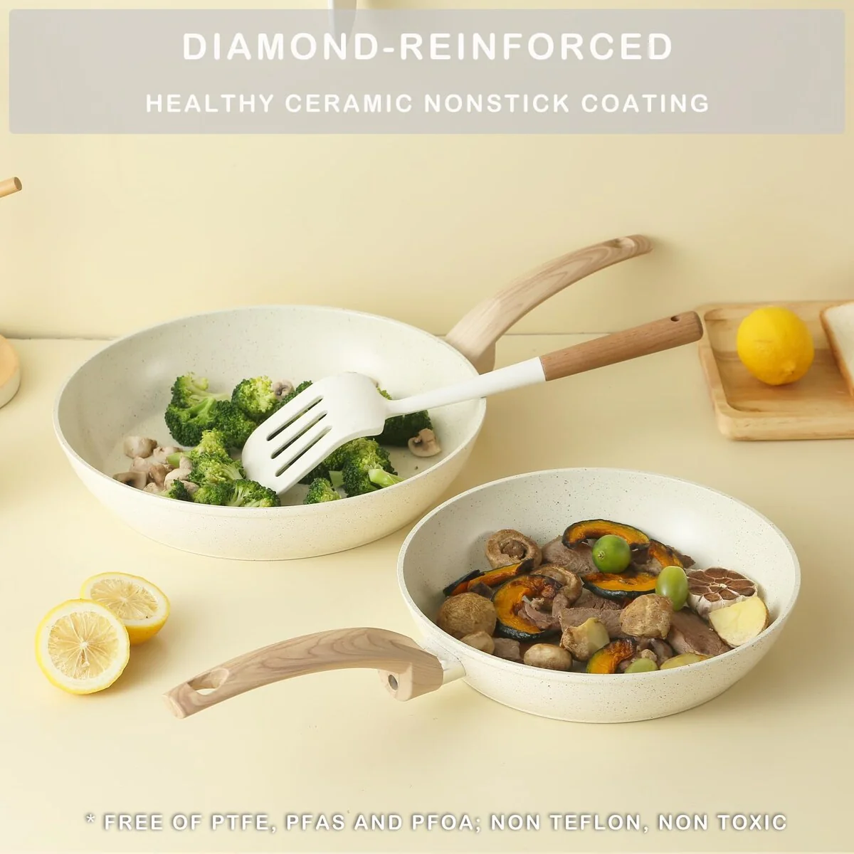 Eco-friendly Ceramic Non-Stick Coating��SGS, TUV certified products, 100% Free of PFOS, PFOA, our cookware ensures your daily cooking being always safer and healthier. Rivetless interior to prevent snags and food buildup. Just using a soft sponge or dishcloth, you can clear oil stain easily. Please do not use sharp or pointy brush, which would do harm to the non-stick layer.