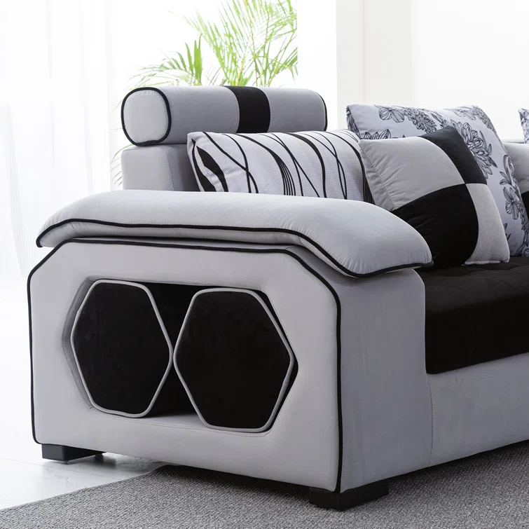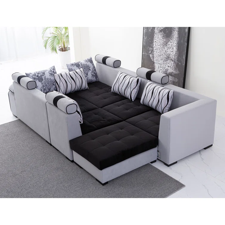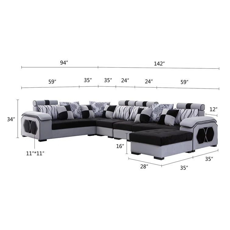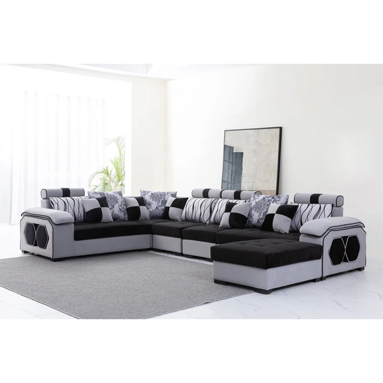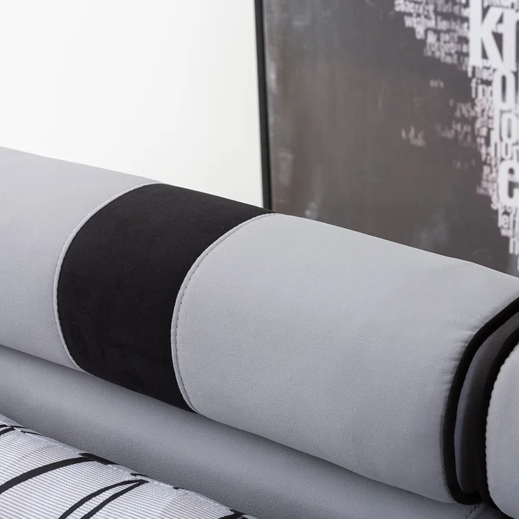 This 11-piece sectional features a modular U-shaped silhouette and seats multiple people, ideal for movie night or the big game. It includes armless and corner chair components, a loveseat, a matching ottoman, and stunningly patterned toss pillows. Made from solid and engineered wood, each piece rests on low-profile corner block legs for a sleek modern look. Wrapped in gray and black microfiber fabric, this sectional is foam-filed with coil springs to provide plenty of support. Plus, cylindrical bolster pillows are attached to the plush backrests for another layer of padding. Storage space at both ends adds a spot to store the four octagonal stools that come with this seating group when they're not in use.