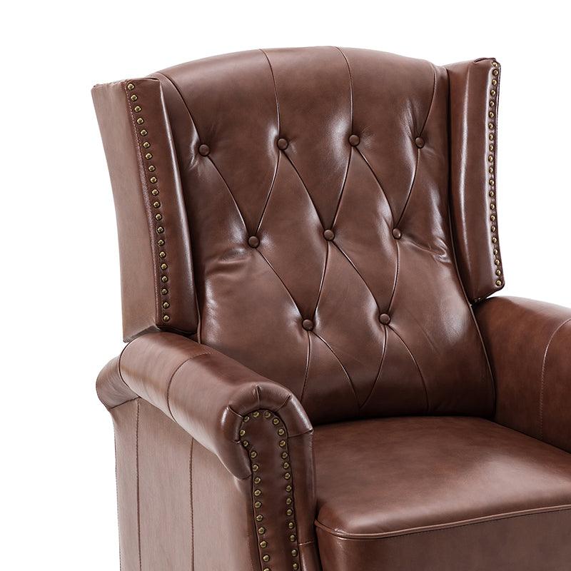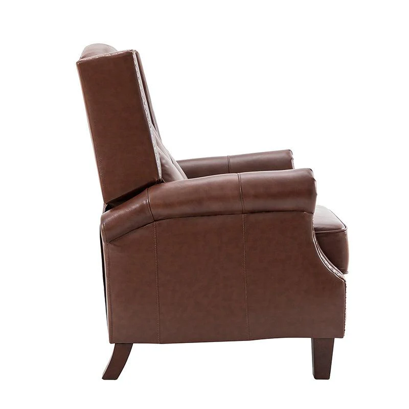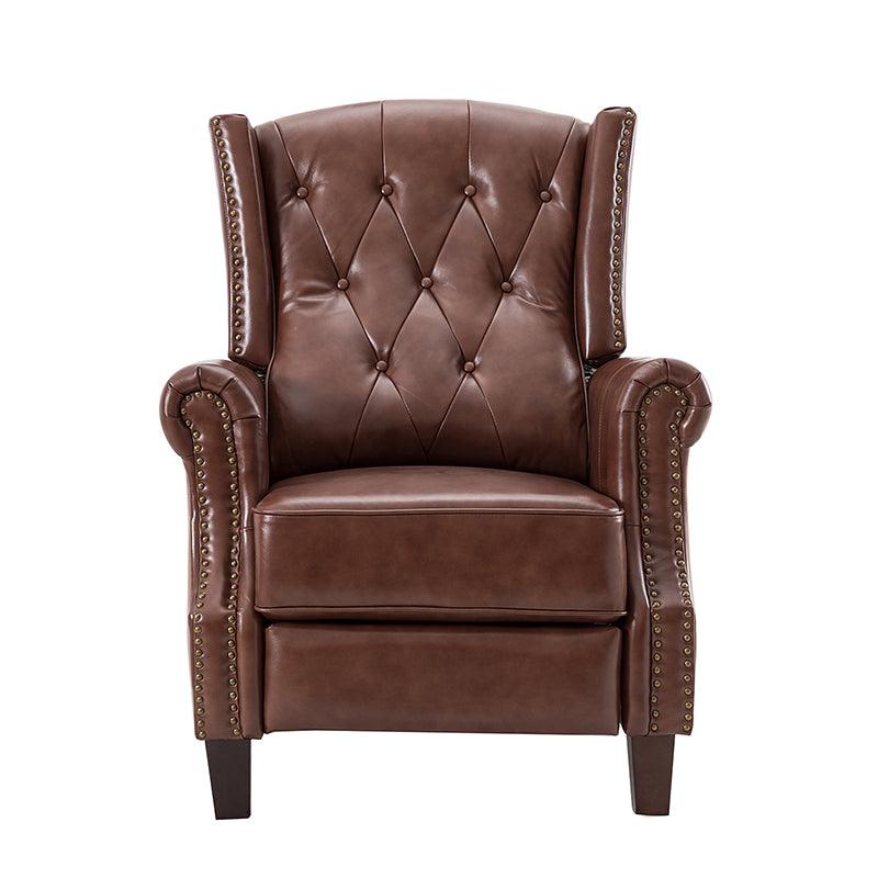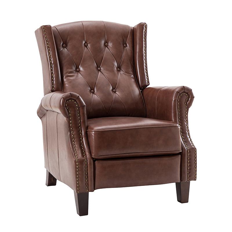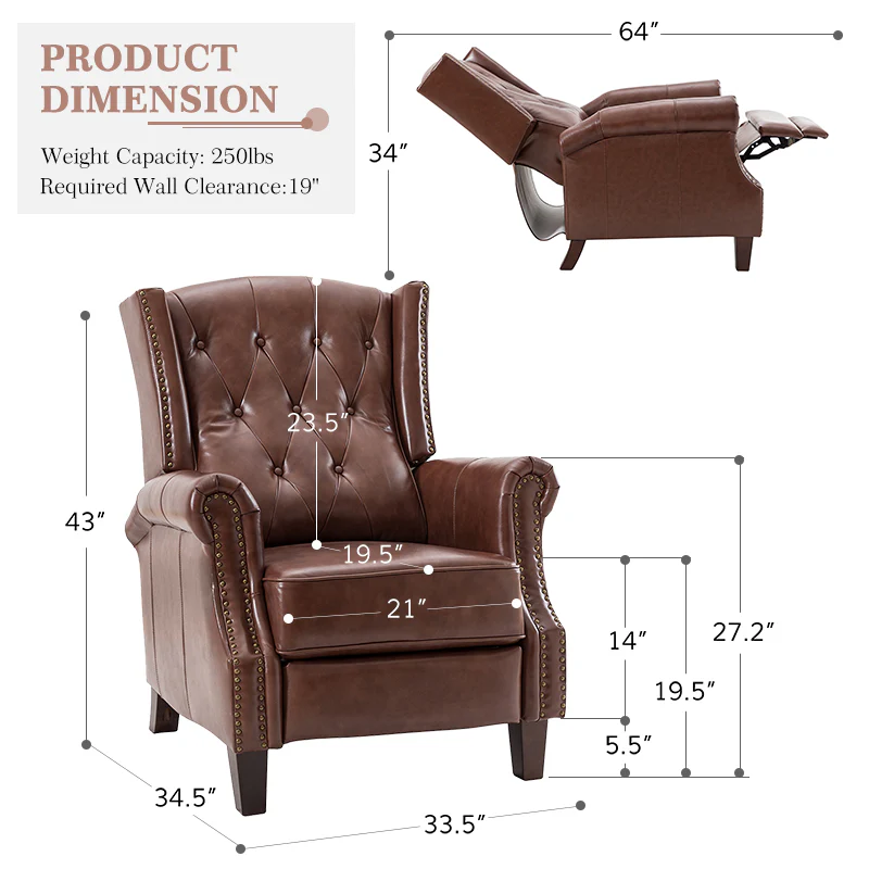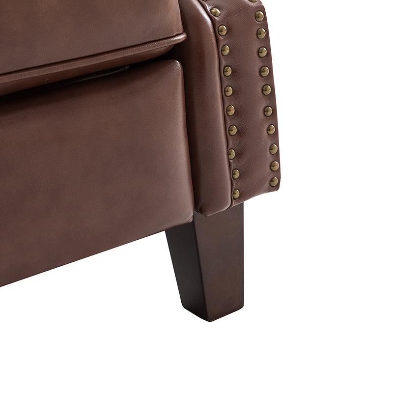 With a sturdy wooden frame, this leather recliner combines classic elements with contemporary style, with accents such as a thick foam upholstered seat. The upholstery is made of genuine top leather foam padded with nailhead trim for an alluring feel. The recliner has a design that conforms to the human body curve and excellent quality. Just push back manually to lay down, no buttons are required, and you can rest easy. The oil-painted wooden legs keep out moisture and insects, and we have considered every detail for you. Comfortable seat and back support for prolonged sitting, watching TV, or relaxing reclining.