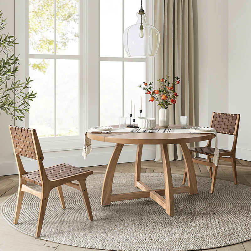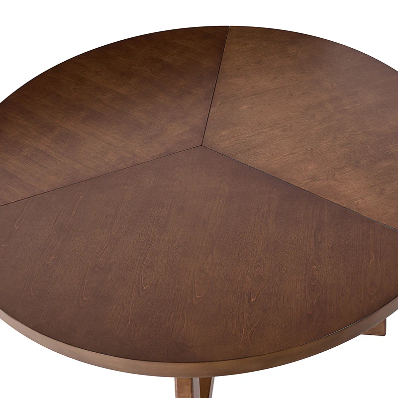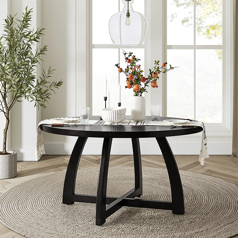 This mid-century modern dining table exudes elegance and functionality. With a generous 54-inch diameter, it comfortably accommodates 5-6 people, making it perfect for gatherings. Its tabletop features a solid wood veneer with a classic antique brown shade that instantly catches the eye. The table top is crafted from premium wood veneers and precision-engineered wood, while the table base is skillfully constructed using solid rubber wood. The distinctive cross-buck pedestal base of the round dining table is beautifully on-trend. A tabletop with a touch of wood grain detail makes the most of the natural variation of the wood. Whether you're hosting a contemporary dinner party or a traditional family meal, this dining table is the ideal centerpiece, blending timeless appeal with mid-century practicality.