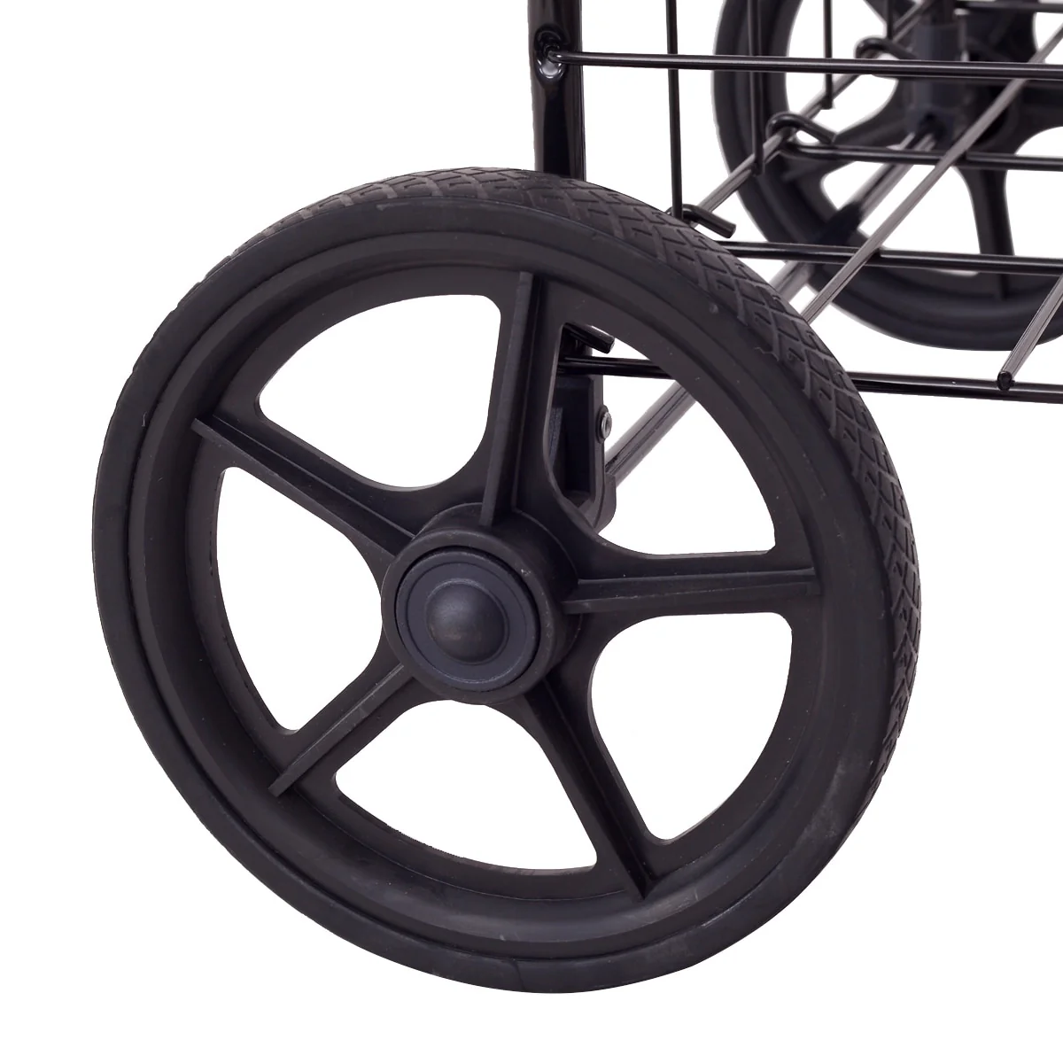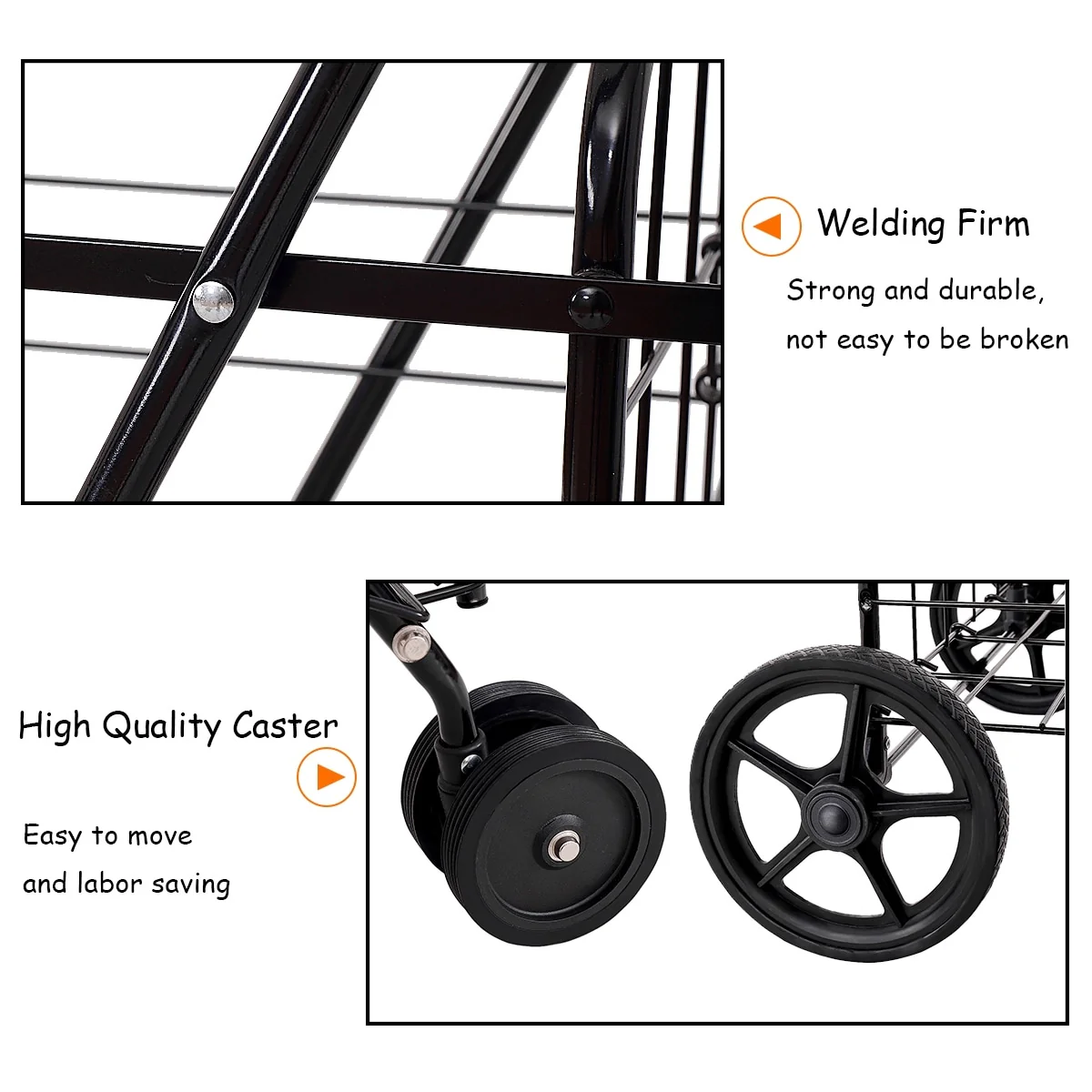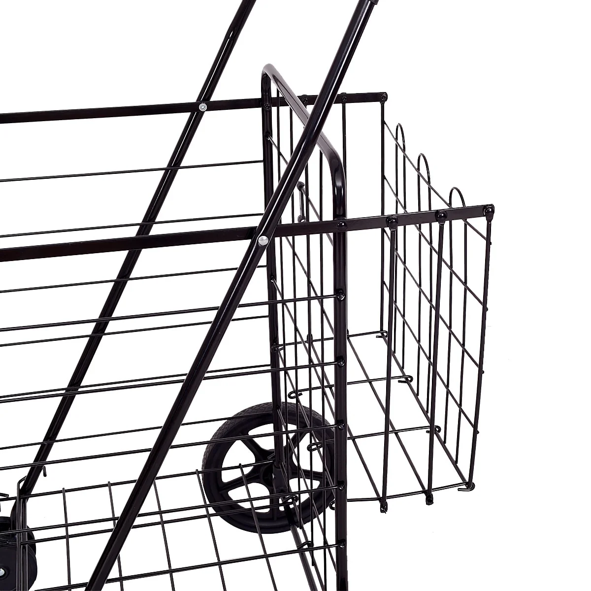 Easily transport laundry, groceries, picnic supplies, and more with this versatile rolling cart. This black metal cart features universal-direction front wheels and sturdy rubber rear wheels, making it easy to even go up stairs. When not in use, this cart folds up for easy storage.