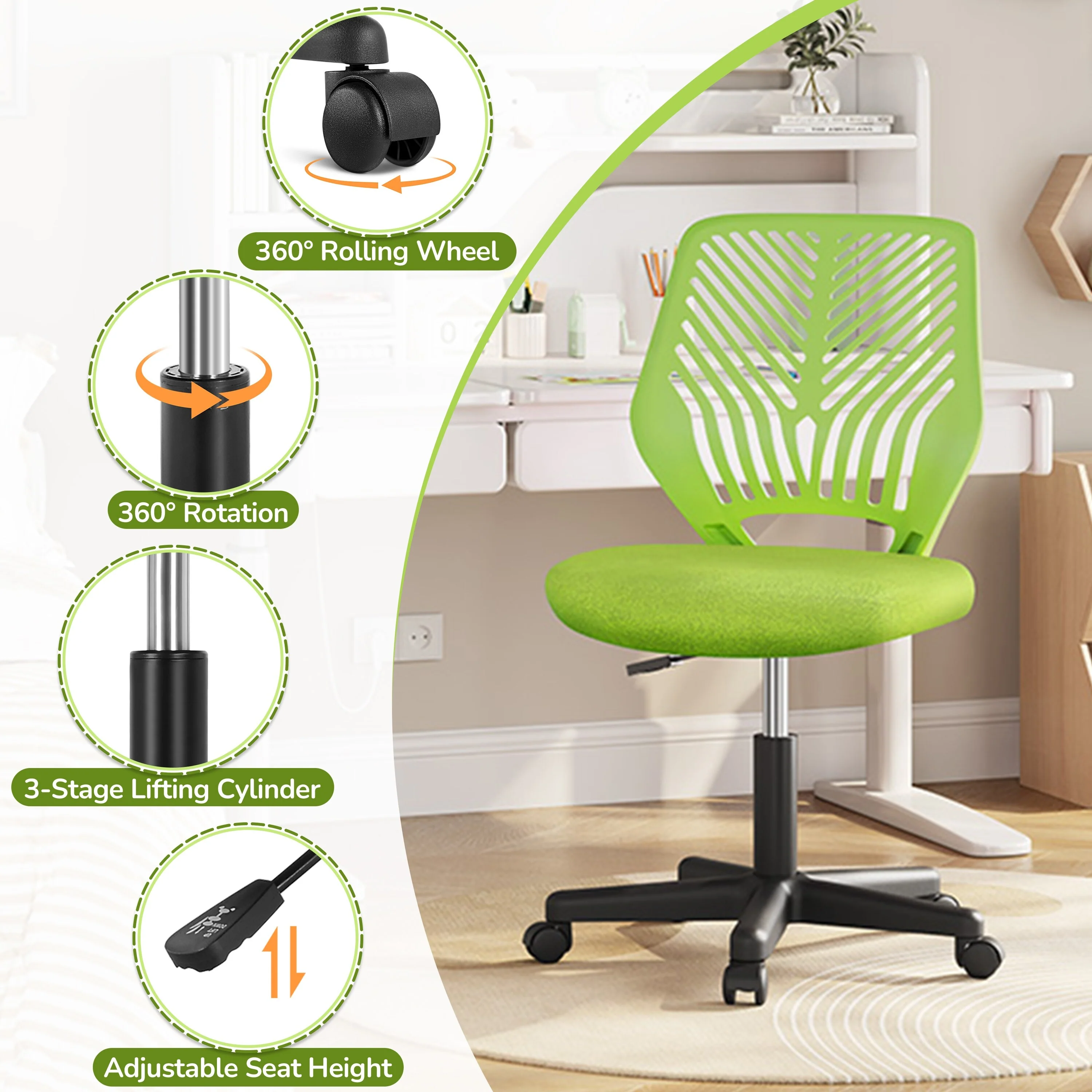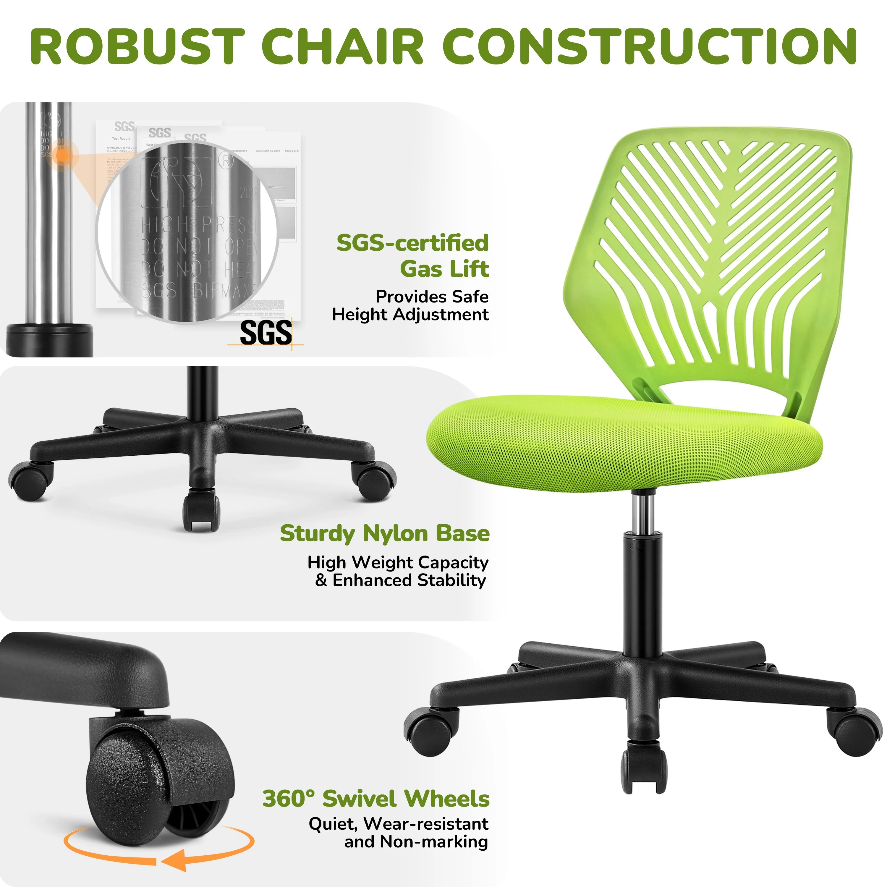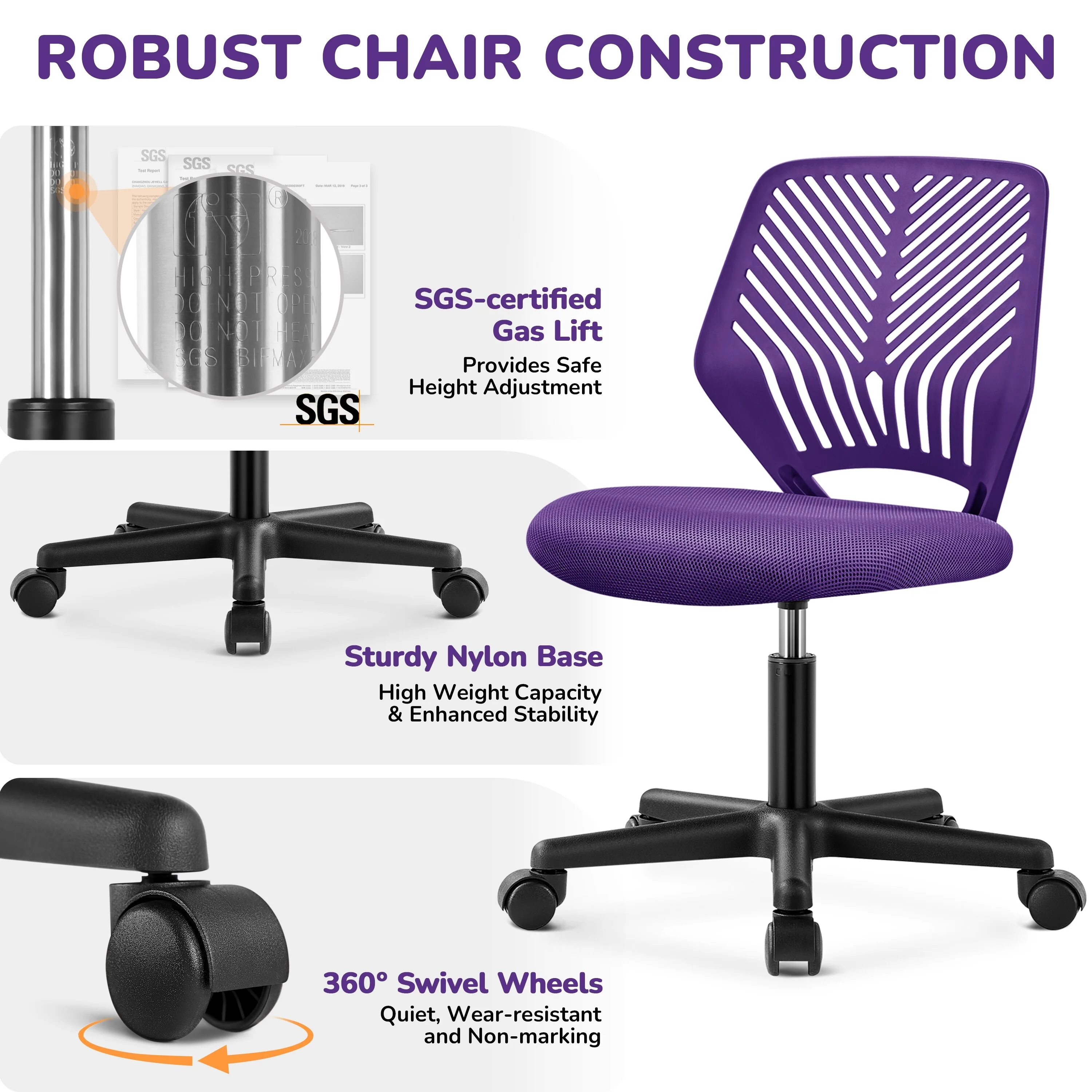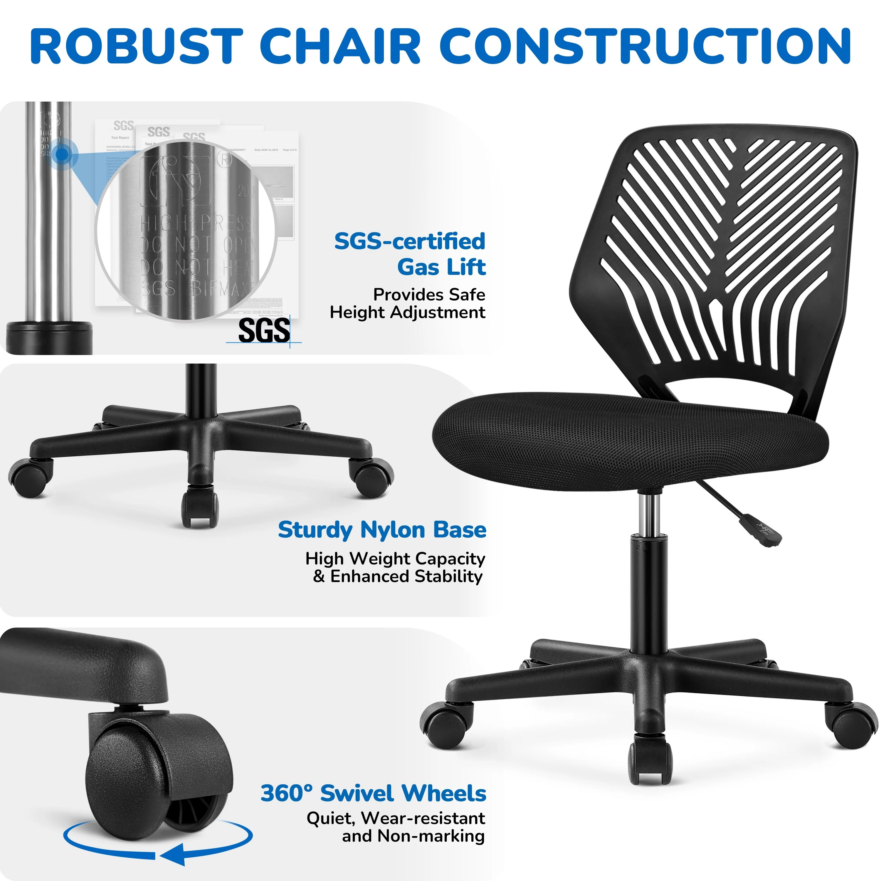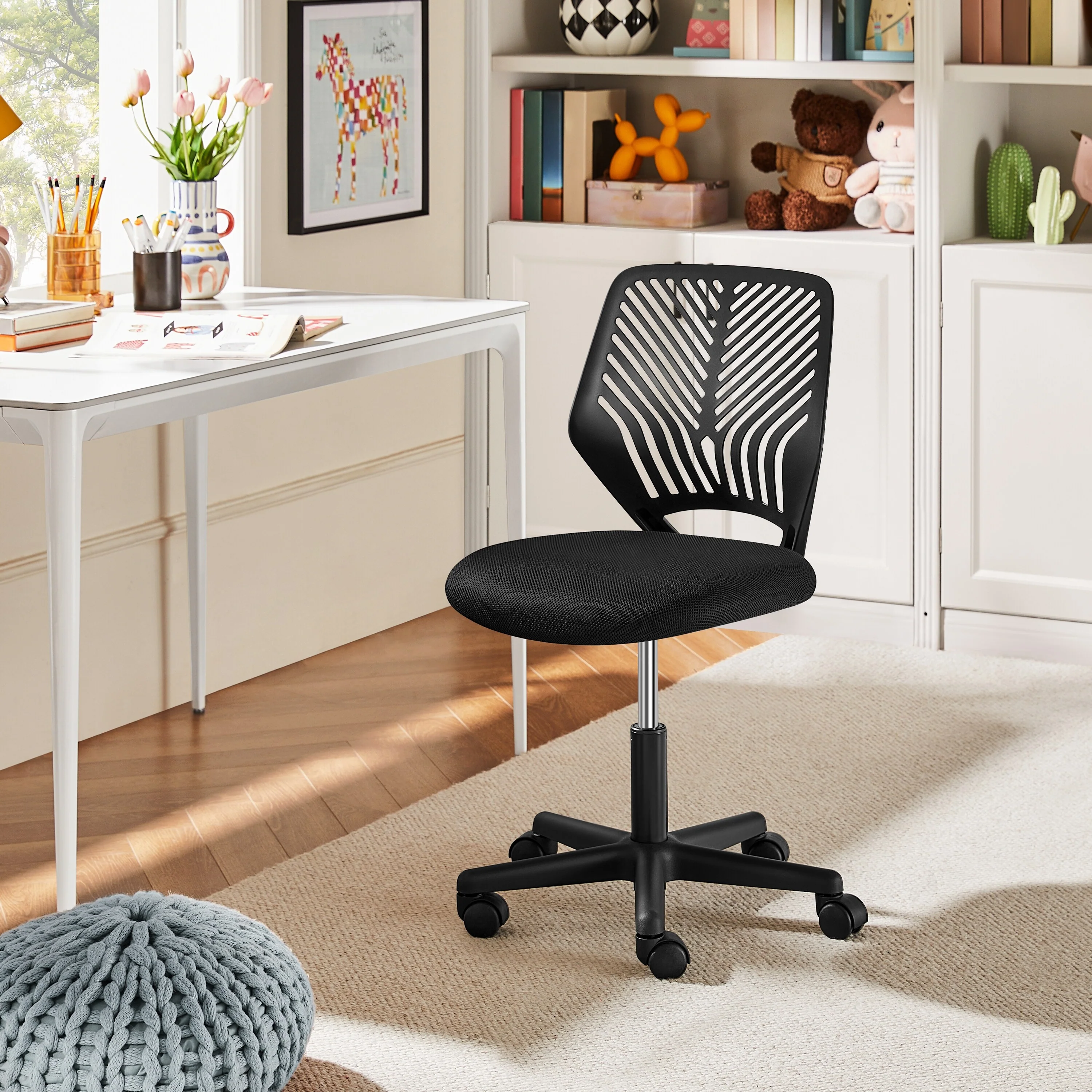 Upgrade your home office with the Yaheetech Adjustable Armless Office Chair Swivel Computer Study Chair. The ergonomic S-shaped back provides excellent lumbar support while the armless design allows for free movement. The chair can hold up to 136kg/300lb and comes in a variety of colors to match your aesthetic. The high-density cushion with double-layer mesh cover ensures comfort and resilience for long hours of work or study. The star base with five mute wheels allows for a 360掳 smooth movement without damaging your floor. Assembly is easy with included tools and instructions.