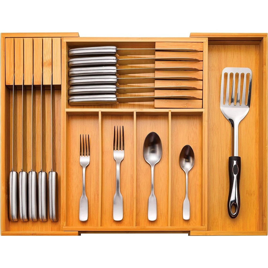Utensil Organizer - Bamboo Expandable Silverware Organizer, Utensil Holder & Cutlery Tray with Divider and Removable Knife Block