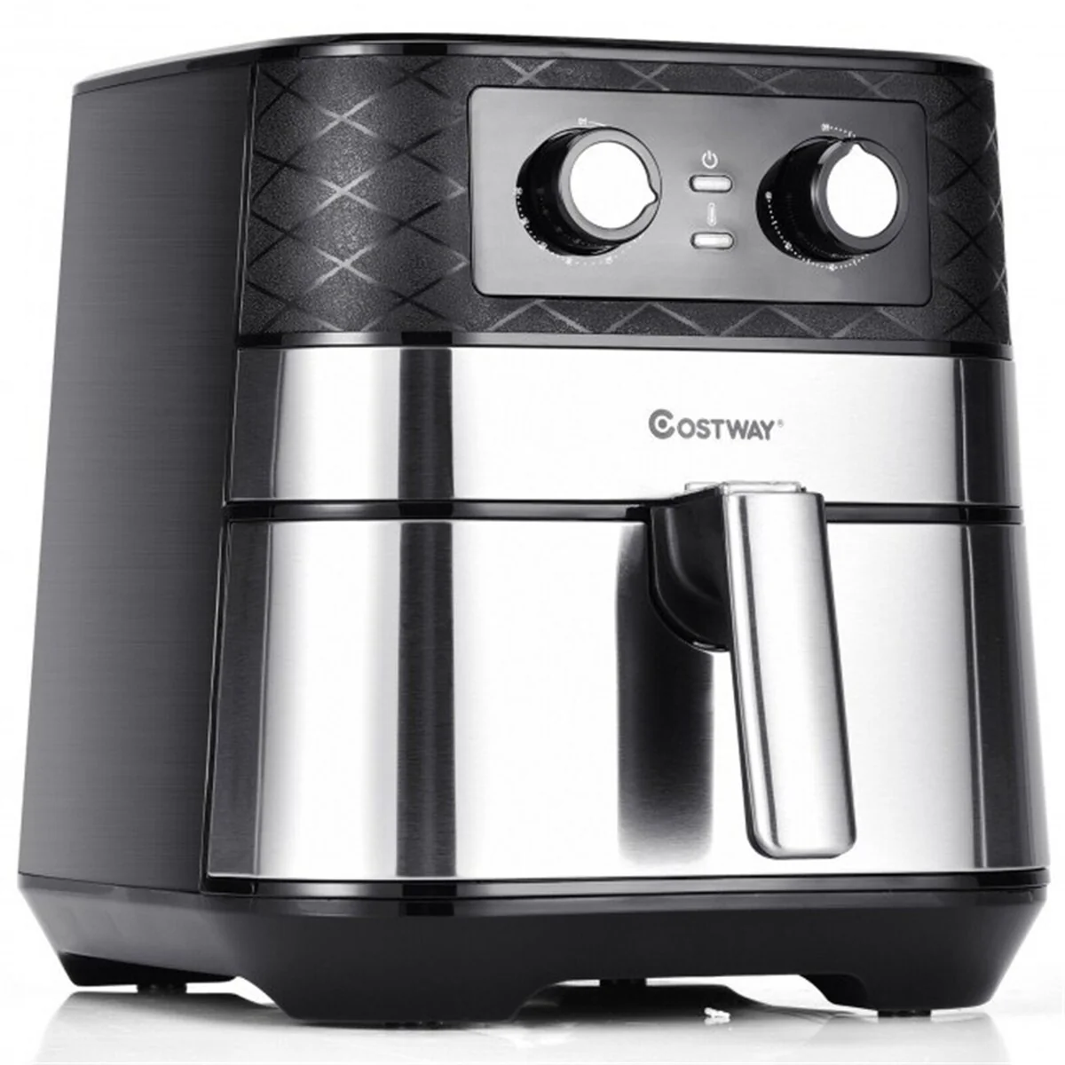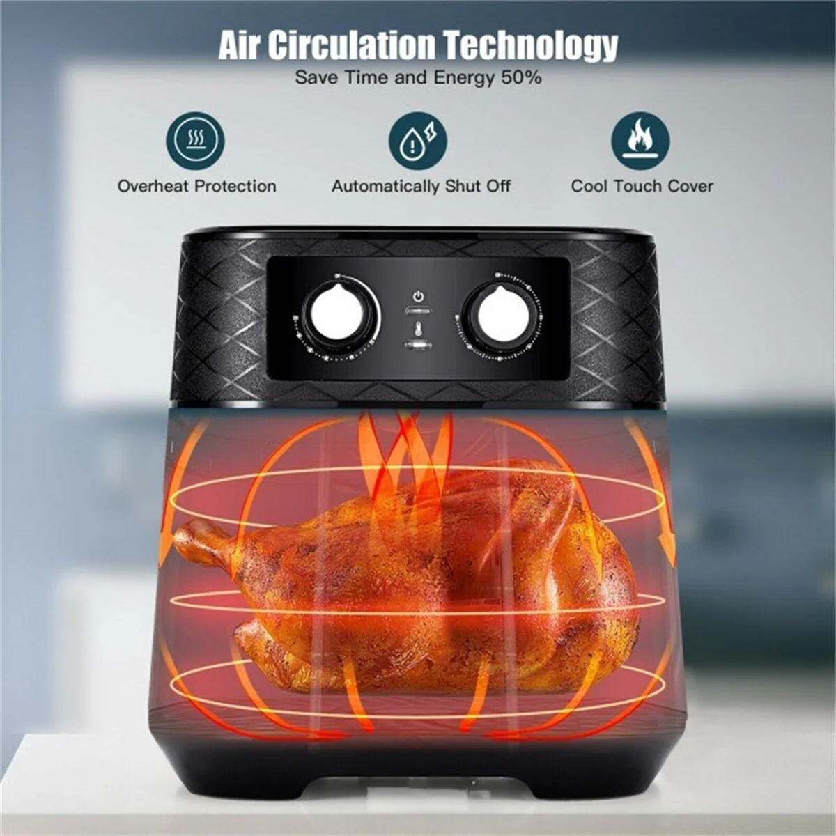 With the recipe guidance, you can make gourmet food by yourself. Featuring 360° hot air circulation technology and large capacity, our air fryer oven allows you to enjoy food together with your family. Easy to use temperature and time control knob is perfect for those who tend to cook their own recipes. Add this 5.3 QT oil-free air fryer to your list and say goodbye to your separate appliances!