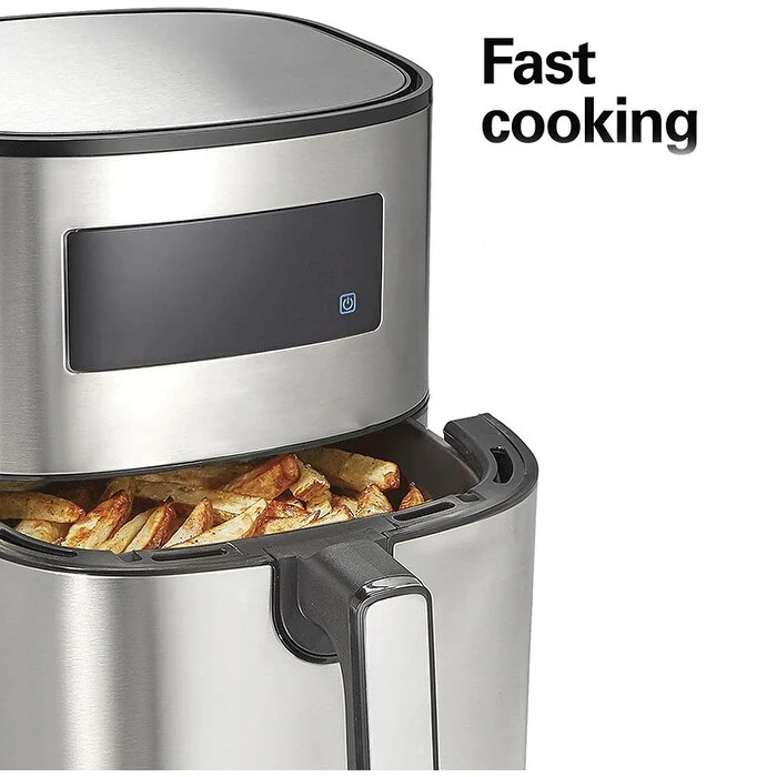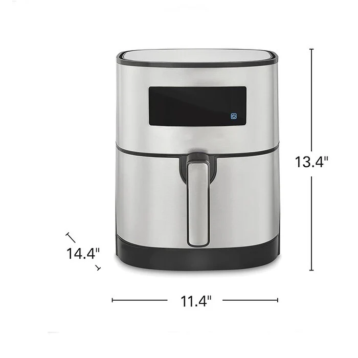 8 ONE-TOUCH PRE-SET FUNCTIONS. The intuitive digital display lets you simply tap to select the icon of the cooking function you want to use on this electric air fryer: steak, chicken, shrimp, fish, pizza, French fries, baked goods and veggies.