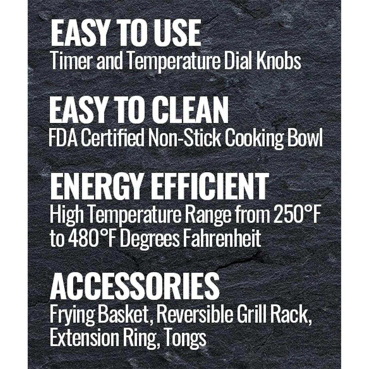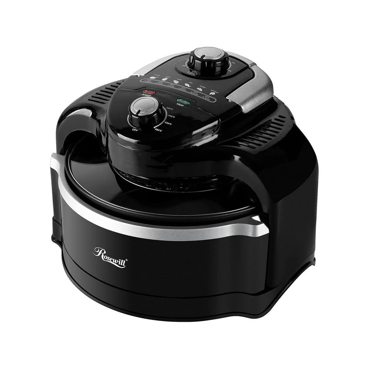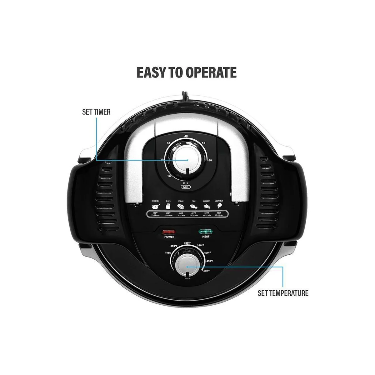 Set from 250 to 480 degrees Fahrenheit with no preheating necessary;