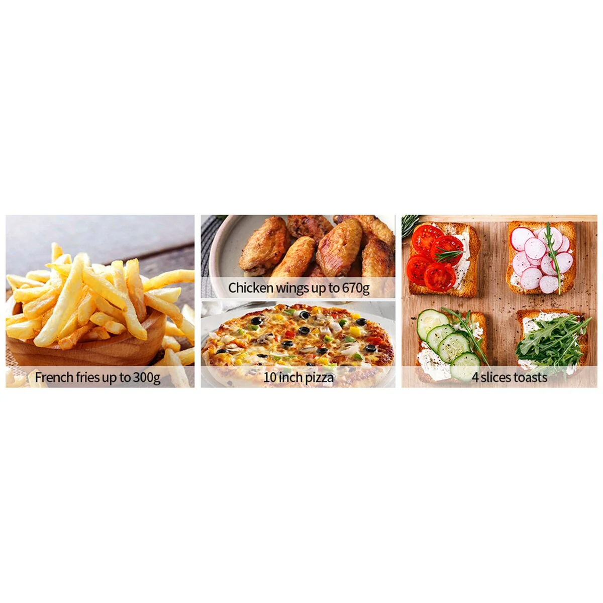 - 【Versatile 6 SmartModes】 :Cake/Chicken/Fish/Pizza/Steak/Toast/Wings/Cookie/Defrost/Skewer/Vegetables/French Fries/keep Warm. The cyclone hot air circulation technology make your food evenly cooked to achieve a crisp and delicious flavor Toaster Oven. It also adjusts the taste of the food according to your personal taste.