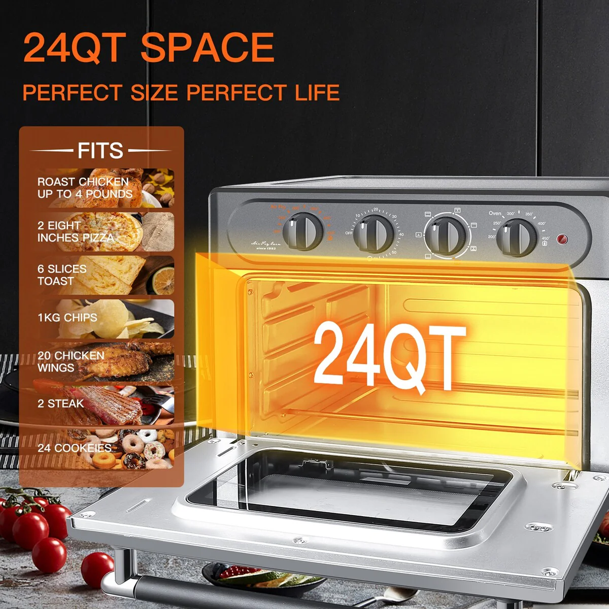 - 【 Family-Sized Perfect Air Fryer Oven 】 This 24 Quart capacity Air Fryer Toaster Oven allows you to prepare a family-sized dinner for up to 10 people! 50% faster than a conventional oven. 3 layers of heating allow you to cook more food at one time. Makes perfect chiffon cake, steak, a 12-inch pizza, 6 lbs chicken, 3 lbs French fries, 6 toast, bread, and veggies.