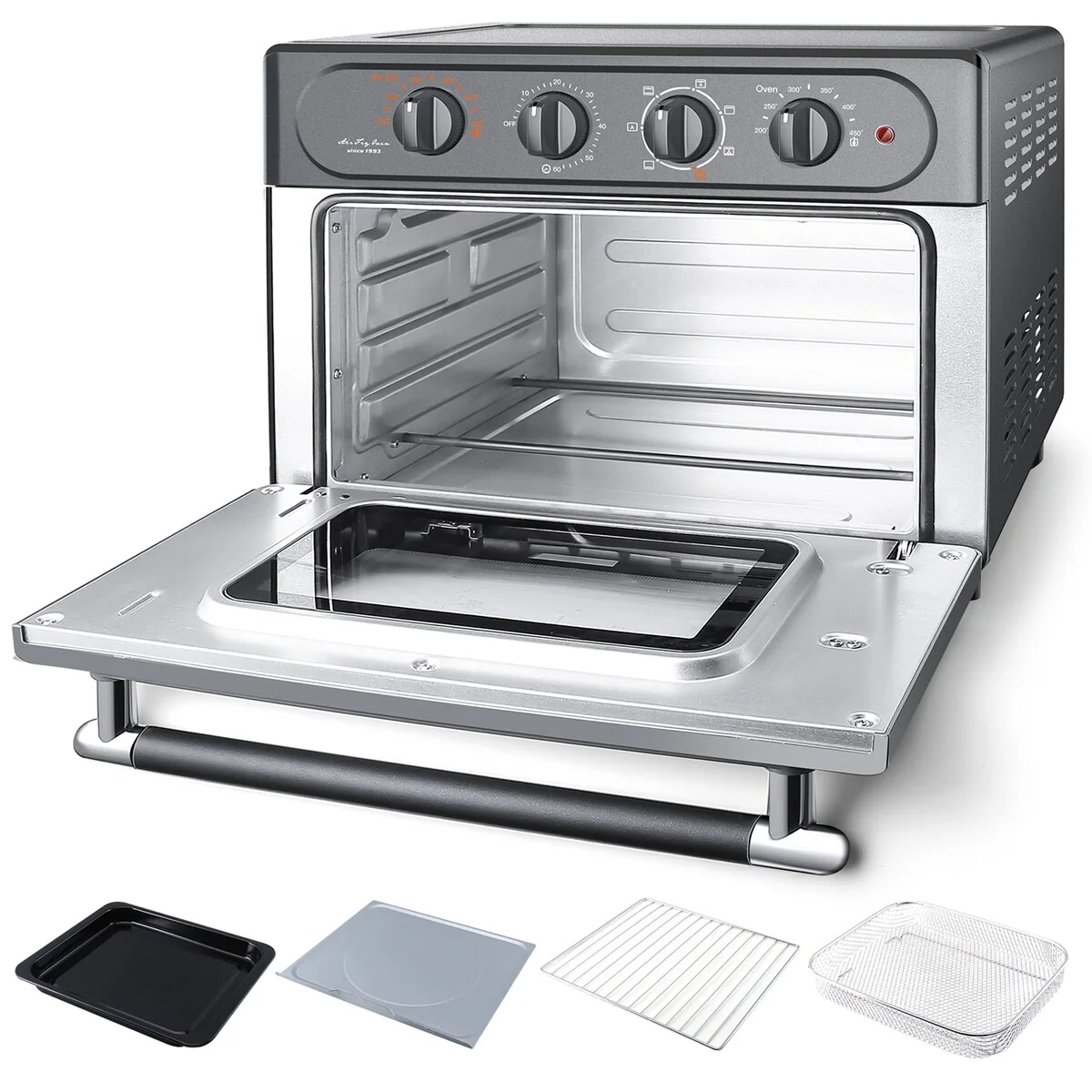- 【 Multi-Function Toaster Oven 】This air fryer toaster oven includes 7 versatile presets: Air Fry, Toast/Bake, Roast, Broil, Defrost, Convection Broil, and Grill. All-in-One Air Fryer Oven. Accessories included: Air fryer basket, oven rack, baking pan, and drip tray. Easy to clean!
