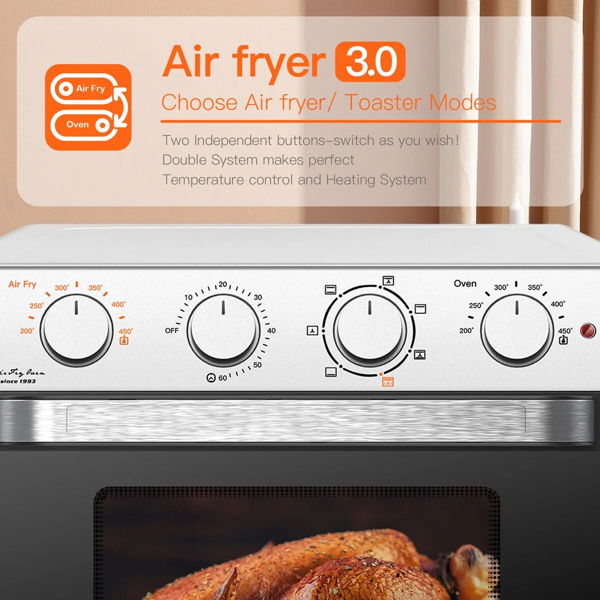 • 【 Easy-use knob operation】No need to worry about pressing insensitive electronic buttons. The classic mechanical knob control panel makes this product very easy and convenient to use! Rotate the knob to Black font to the Toast/Bake Mode. You will have the fluffiest cake! Rotate the knob to Orange font to the Air Fryer Mode. You can enjoy these crispy and healthy French fries!