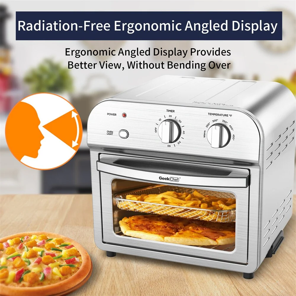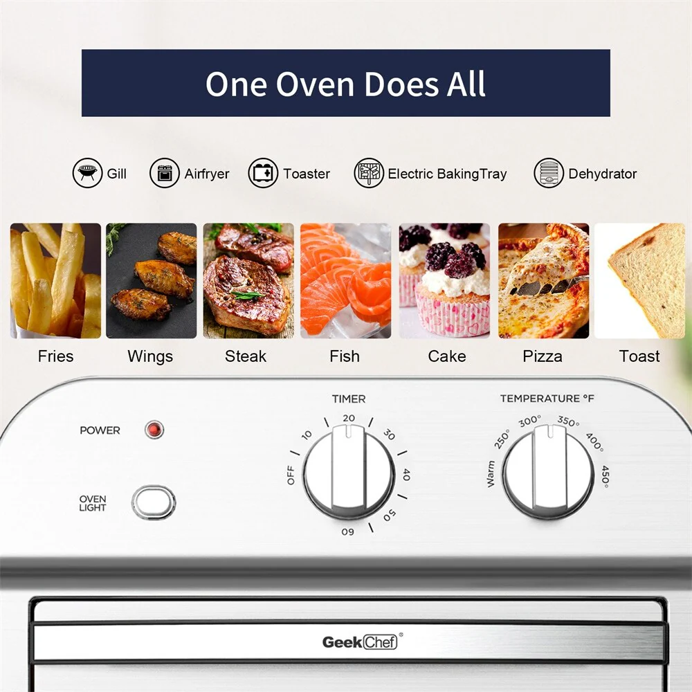This unique kitchen appliance is actually a premium full size toaster oven with a built-in airfryer function. That means it not only bake, broil, and toasts, it also air fry. Air frying, which uses powerful ultra-hot air, is a innovative way to prepare delicious fried favorites by cutting over 85% fats. When the machine turn on, the air fry funtion will be turned on automatically. Enjoy the crunch without the calories and messy cleanup, with Geek Chef AirFryer Toaster Oven!