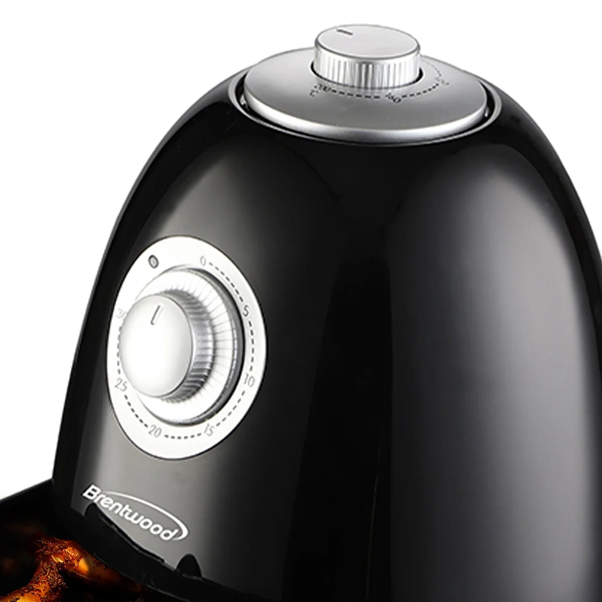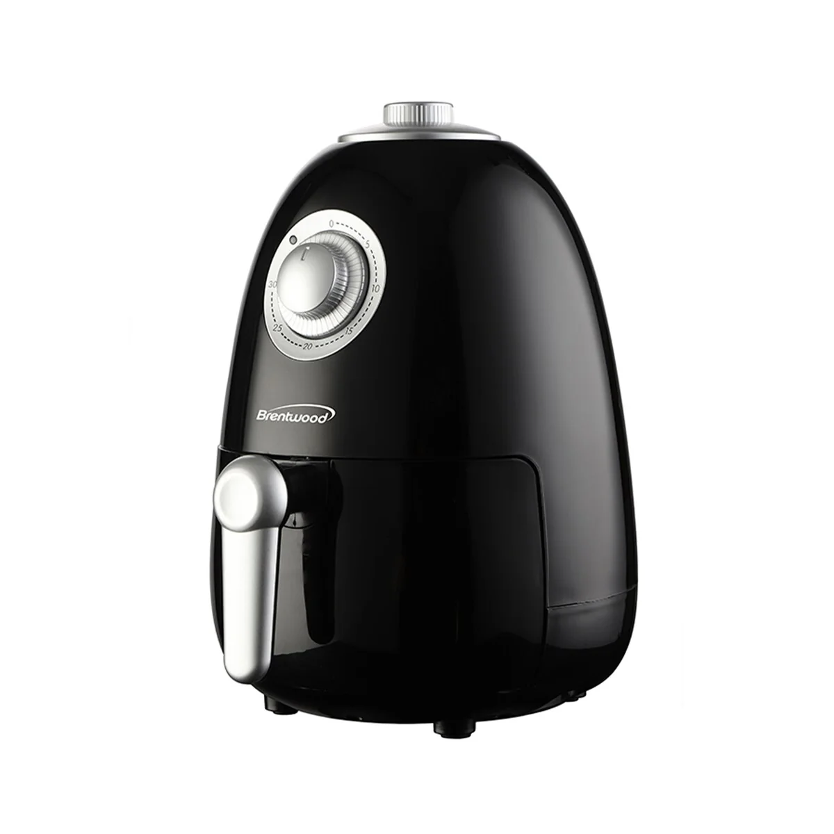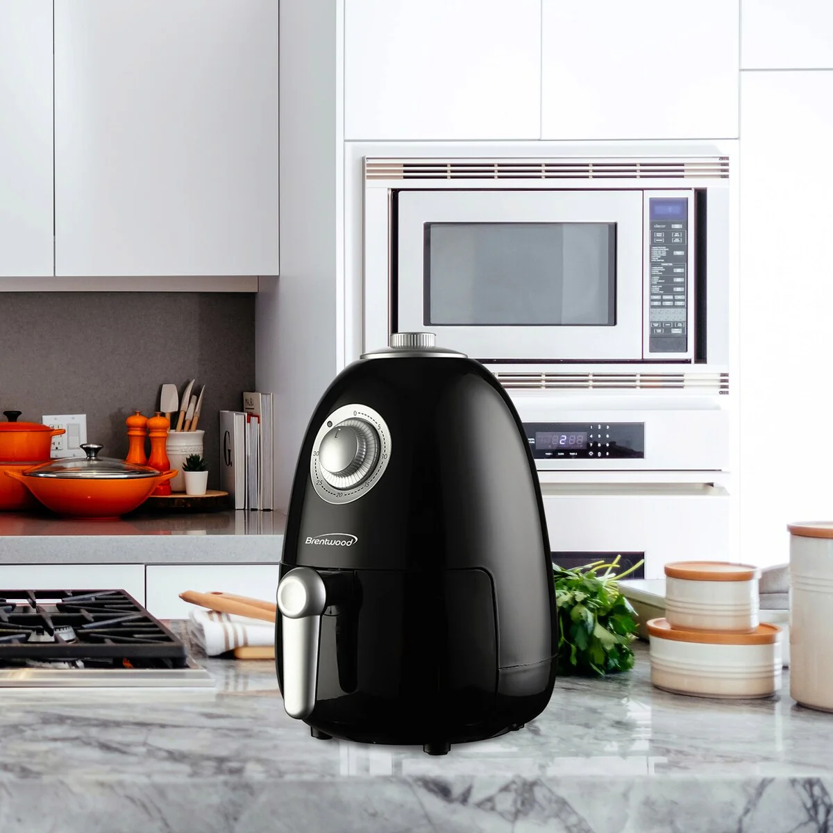 The powerful 800w Brentwood 2 Quart Small Electric Air Fryer with Timer and Temp. Control fries quickly and evenly using little to no oil. Make crispy french fries, chicken wings, veggies and more. Features quick temp guide and 30 minute timer with auto shut off. Easy to clean removable fry basket and drip pan. Our adorable black air fryer looks great on every kitchen counter. Have peace of mind knowing that you will enjoy a healthier solution to frying.
