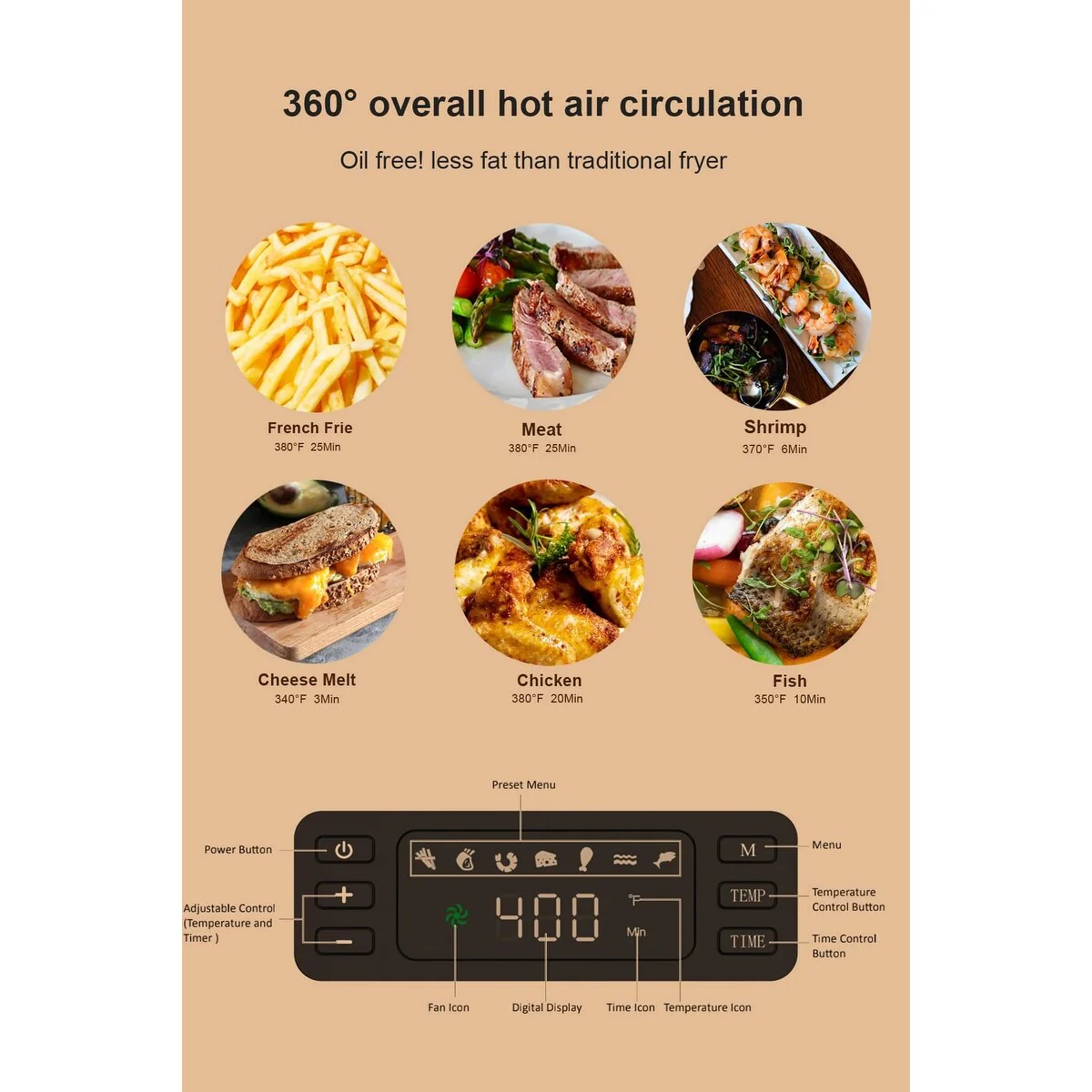- 7 one-touch presets: steak, chicken, shrimp, seafood, French fries, vegetables, bread