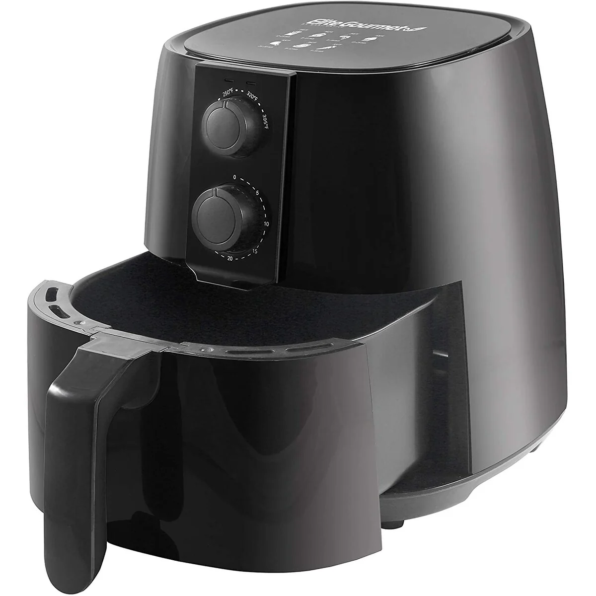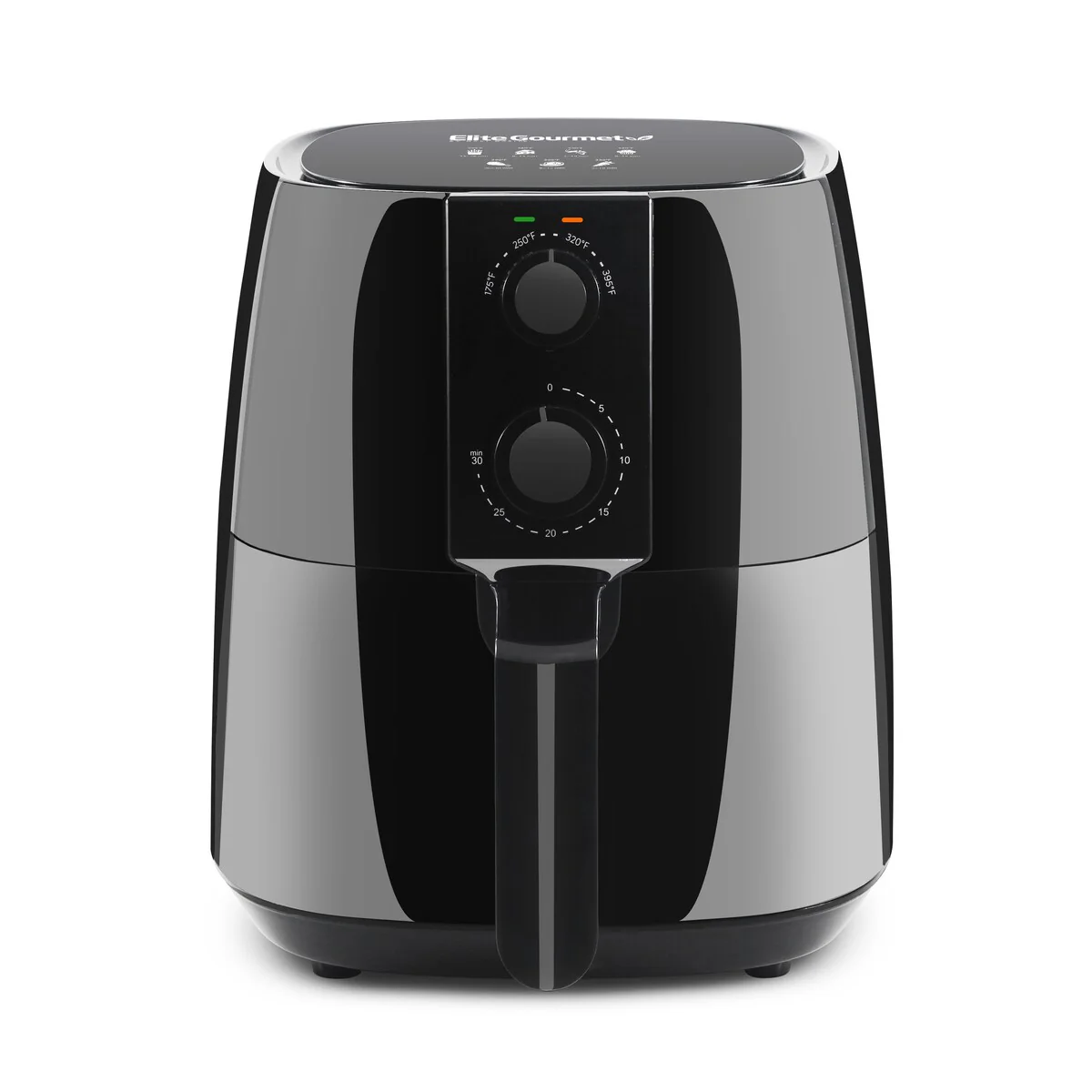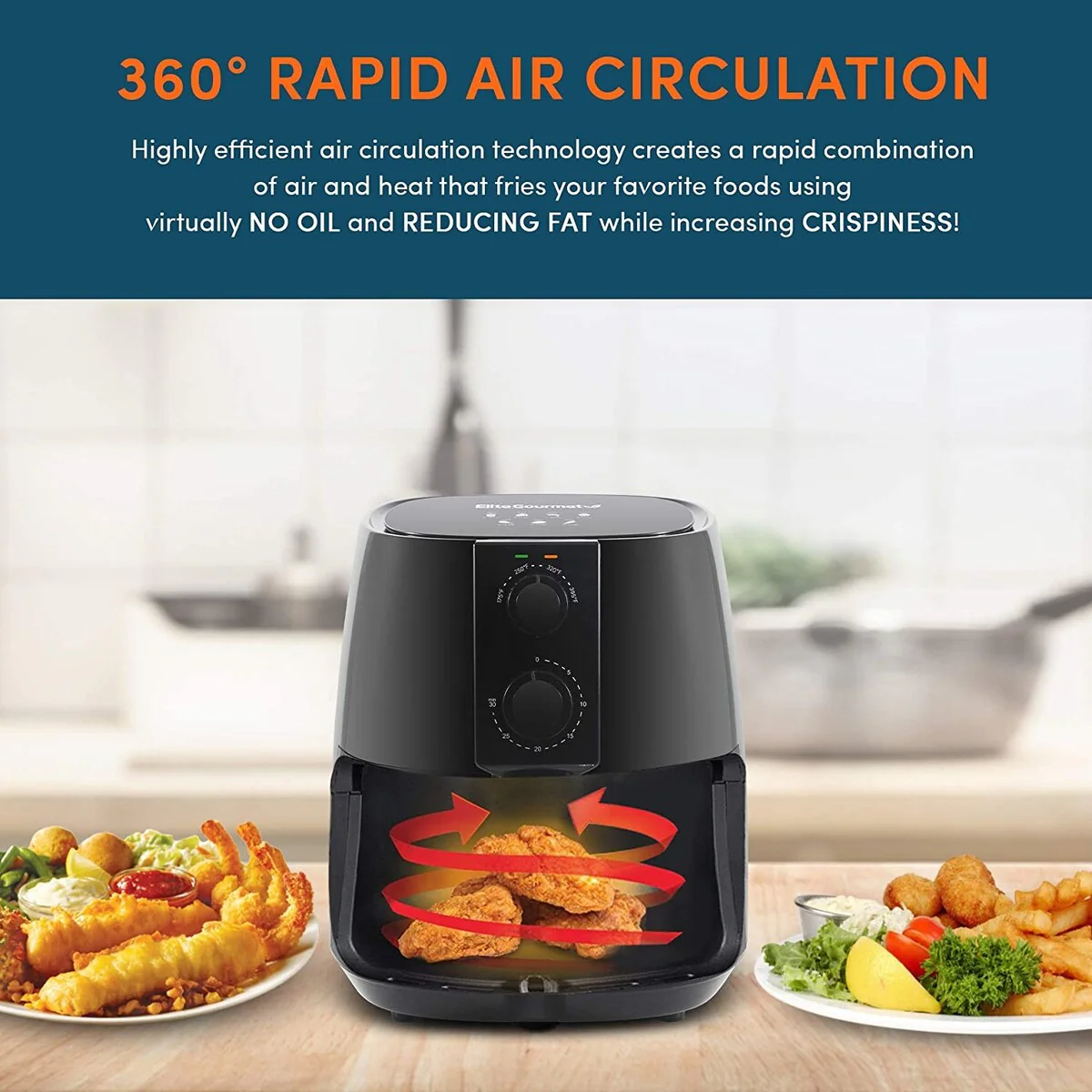 Elite Gourmet Oil-Free 4 quart Air Fryer can handle a wide array of cooking tasks. With its large 4 quart capacity and easy to use temperature and timer controls, you can fry, cook, or even bake your favorite meals and snacks with ease for the whole family! Not only can you cook foods without the mess of oil but you can cook faster which saves you time and energy. Unlike most conventional deep fryers, the Oil-Free Air Fryer's unique vapor system combined with circulating hot air will automatically make foods crispier and of course healthier without oil.