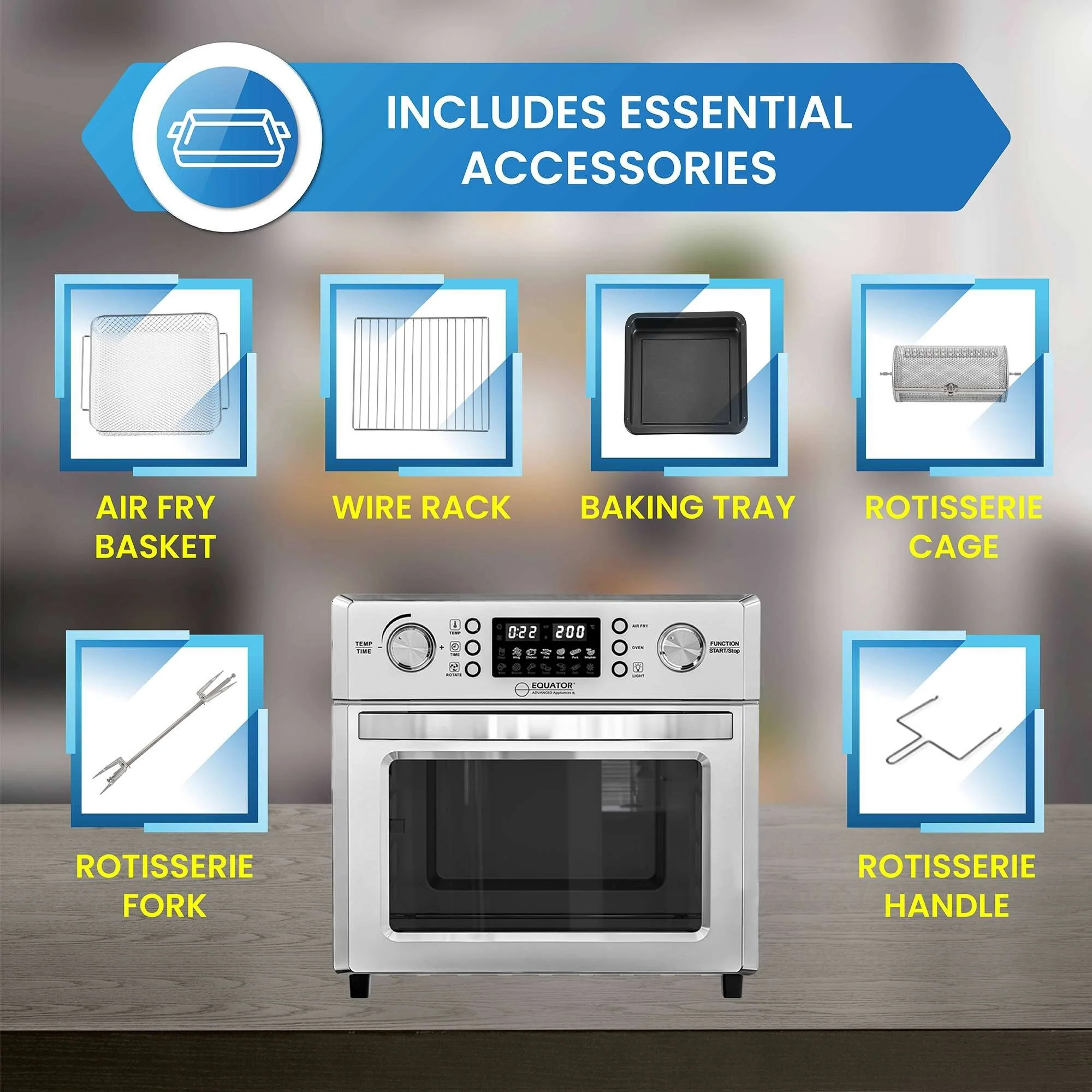 Essential Accessories Included - Air fry basket, wire rack, baking tray, drip/crumb tray, rotisserie cage, rotisserie fork, and handle—every tool you need to start cooking like a pro.