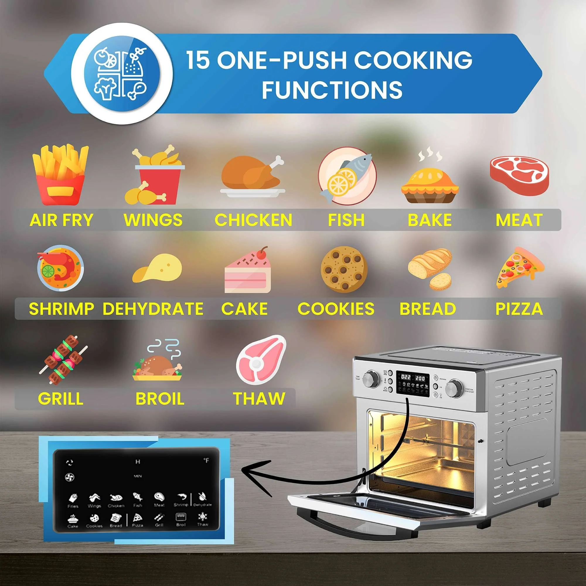 15 One-Touch Cooking Functions - Effortlessly cook wings, fish, shrimp, cake, bread, pizza, cookies, grill, broil, thaw, dehydrate, and more at the push of a button.