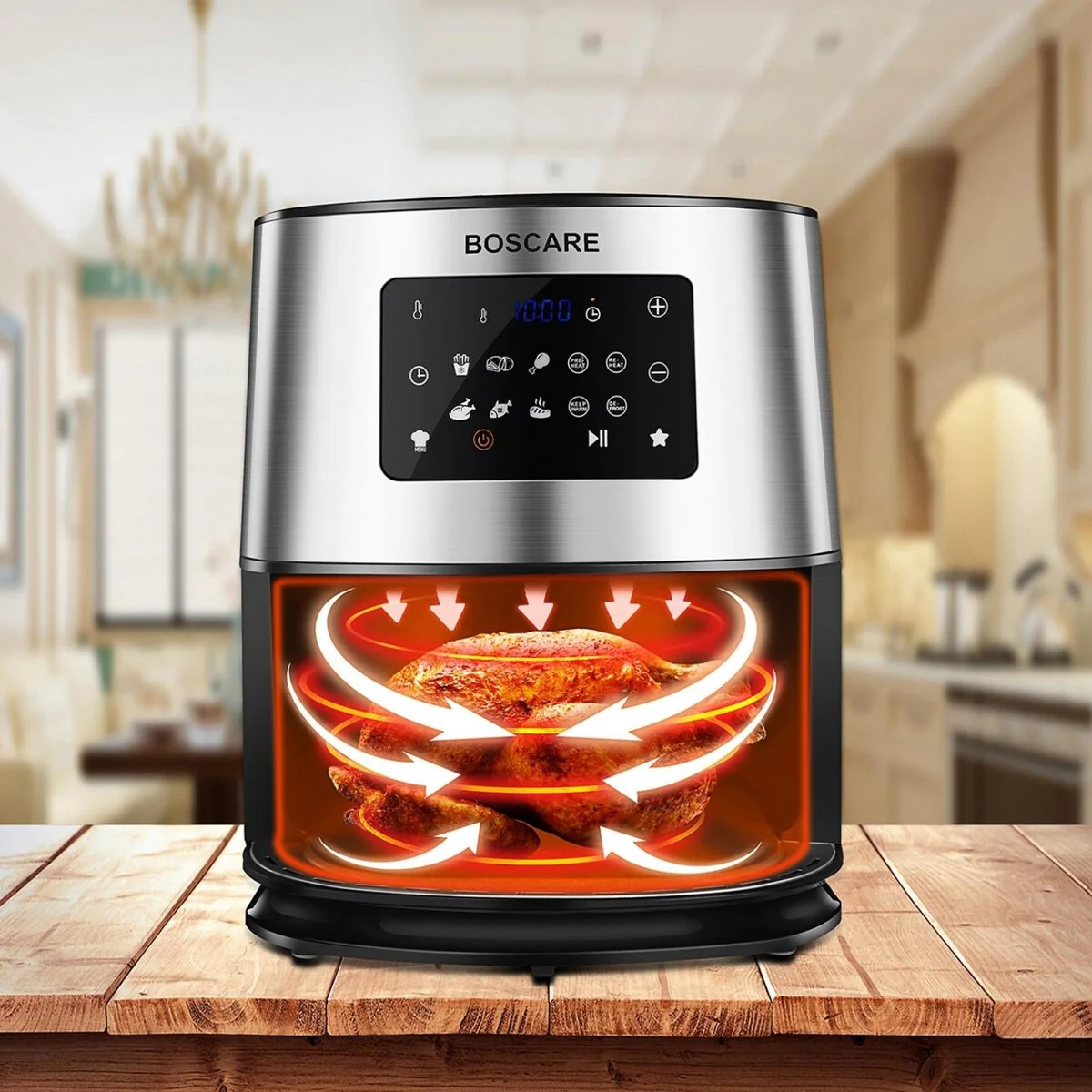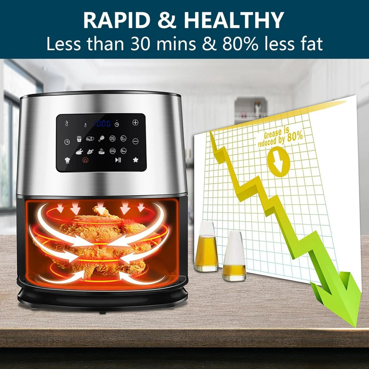 【Large Capacity& High Power】This 6.3 Quart/6L air fryer which can fit 800g Chicken Nuggets or 8 pieces Cupcakes with ease is a necessity for the family of 2-7 people.Up to 1700W power greatly reduces cooking time and not let the time limit your enthusiasm for cooking.Imagine that when you get home from work put the seasoned food in the basket press the preset button and the alert bell rings before 30 minutes you can already taste delicious food. The exhaustion of a day's work was wiped out.