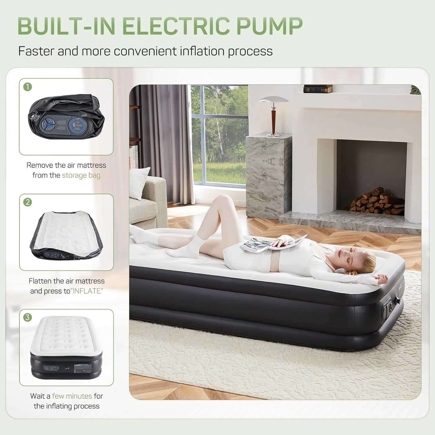 - Built-in Electric Pump for fast inflation/deflation: built-in 110-Volt high-power electric air pump, quietly inflates/deflates the air bed in minutes with the push of a button, this integrated pump simplifies the inflation process, eliminates the need for manual valves, and significantly reduces the risk of leaks while speeding up inflation and deflation times, enjoy fast setup times tailored for different sizes: 22 in. queen - 240s, 18 in. queen - 200s, 16 in. queen - 150s, 18 in. twin - 130s, 16 in. twin - 110s.
