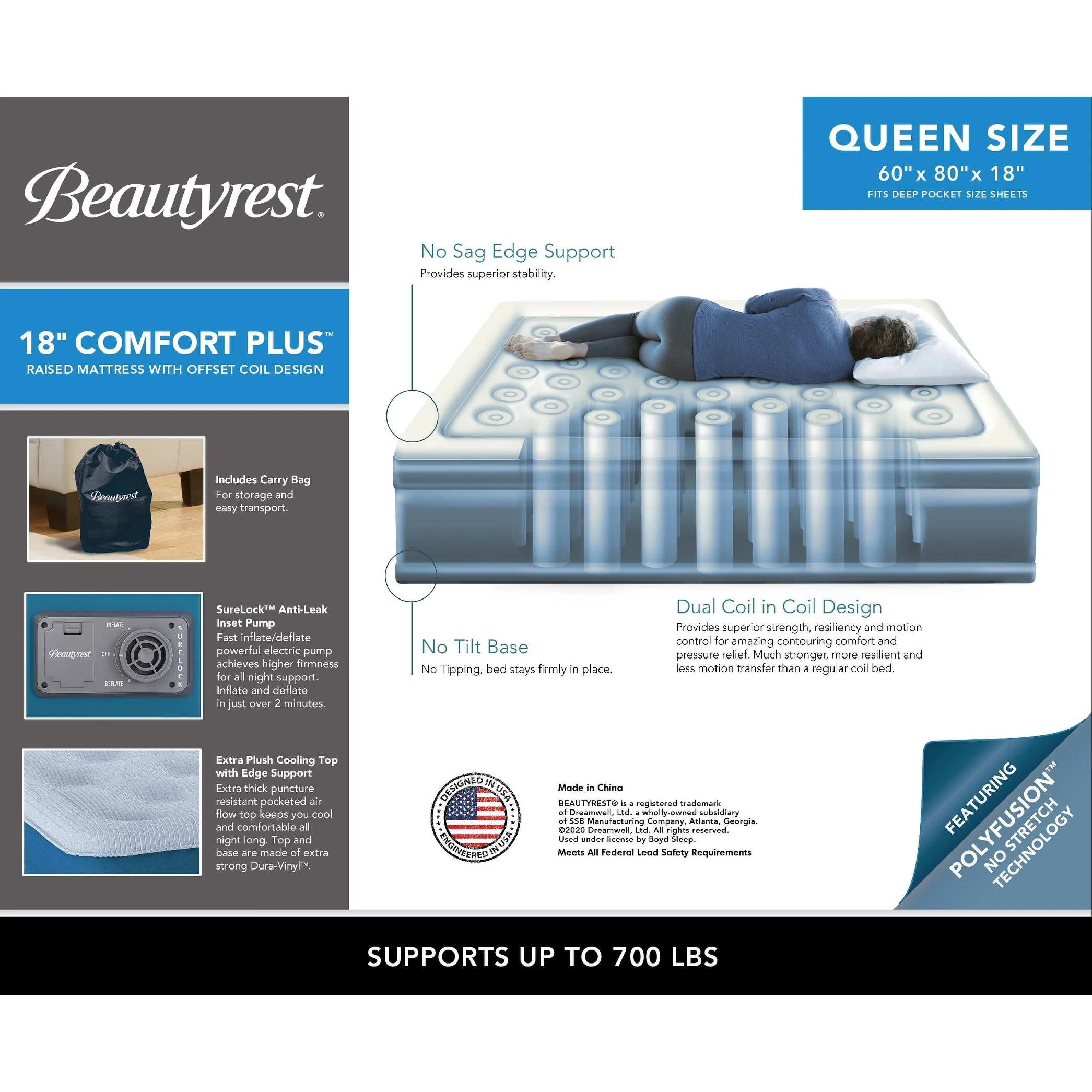 Experience ultimate comfort and durability with the Beautyrest Comfort Plus Air Bed Mattress. With an 18' raised height, this premium product features an offset coil design that minimizes motion transfer and a cooling plush topper with edge support for air flow and roll-off prevention. The Polyfusion EverFirm fabric ensures no leaks or stretch, while the Sure-Lock built-in pump with spring-loaded locking system holds pressure for uninterrupted sleep. Treated with Sleep Fresh anti-microbial treatment and backed by a 3-year warranty, this air bed is perfect for your guests or everyday use.