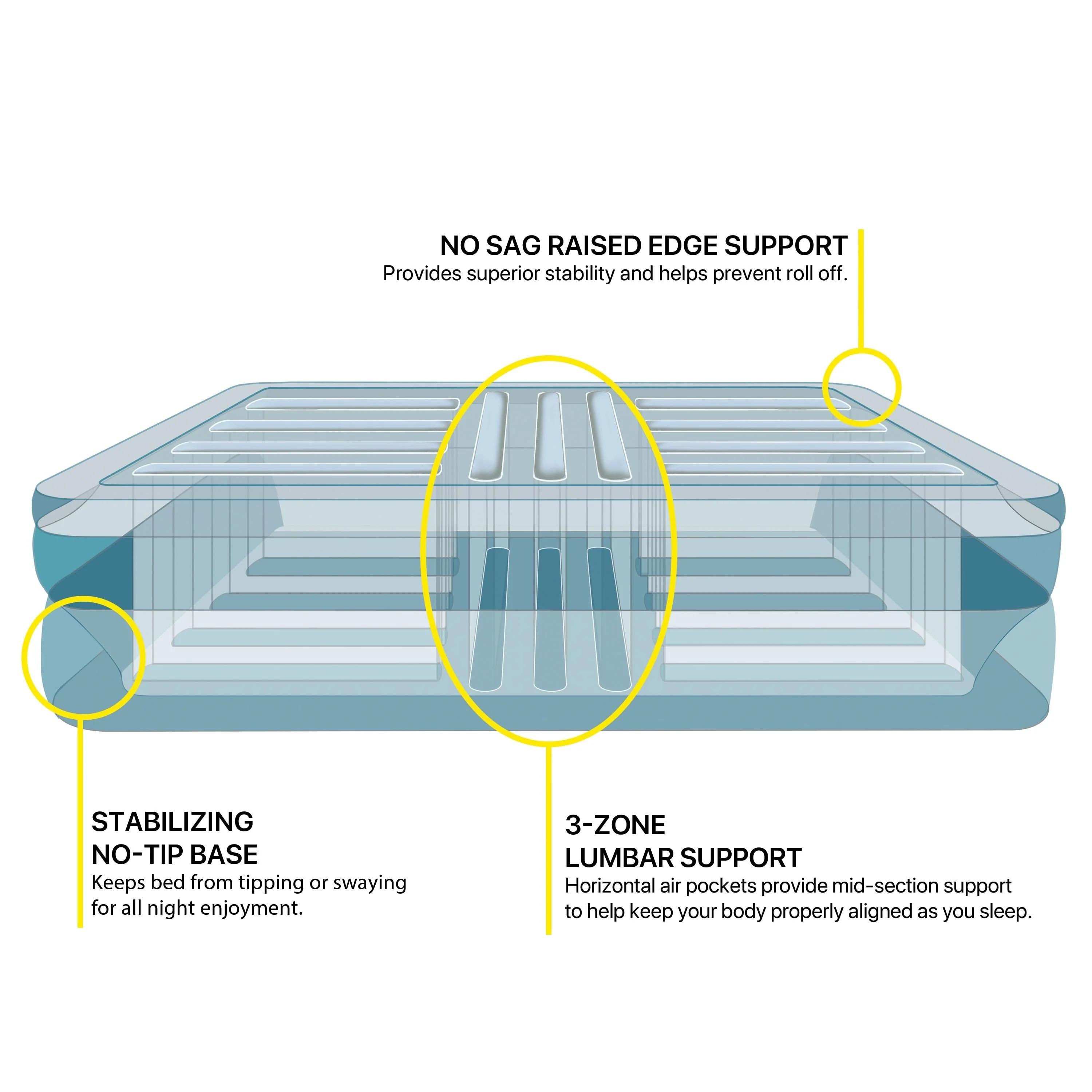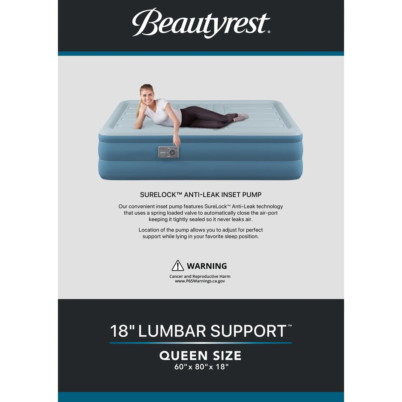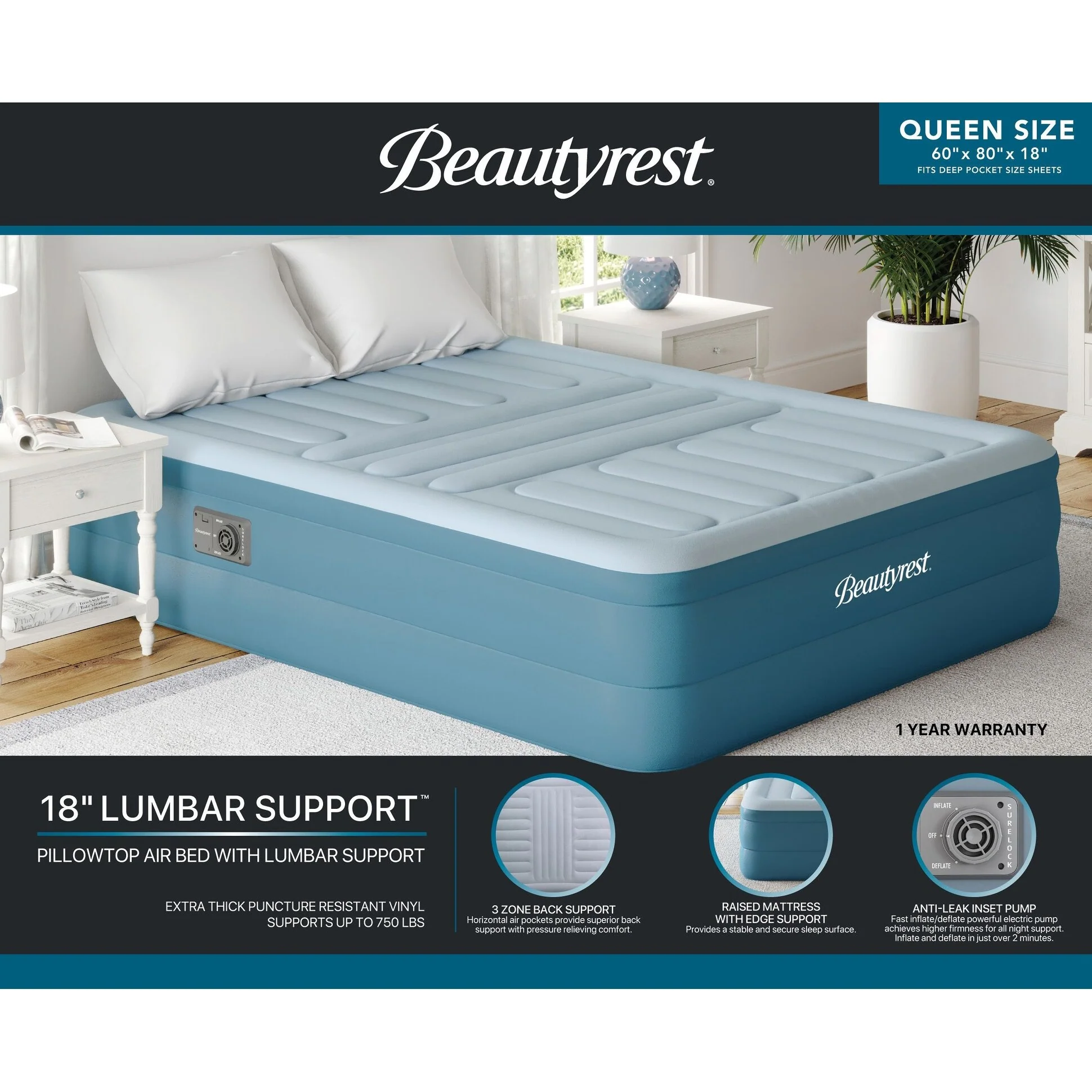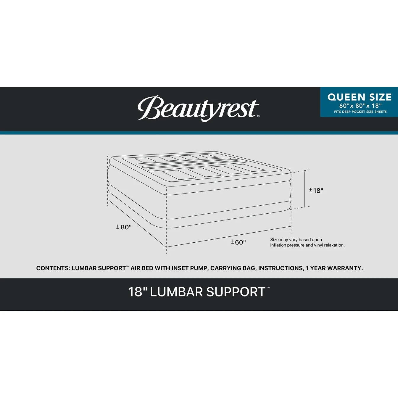 This Beautyrest Silver Lumbar Support Queen Air Bed Mattress with Built-In Pump is an ideal choice for anyone who places a great deal of value on getting a good night's sleep. It can serve as a comfortable extra bed when guests come to visit, or you can take it with when you go camping if you would prefer a more luxurious place to sleep while roughing it. The heavy-duty vinyl and Oval-Beam construction makes this Beautyrest air bed much more appealing and durable than you will find with ordinary inflatable mattresses. The Tri-Zone Lumbar Support Top has uniquely designed horizontal air pockets to provide extra mid-section support and stability for ideal body alignment. The built-in electric pump makes inflating this Beautyrest air bed a snap, and by turning the dial on the pump, you can adjust the bed to your comfort level, whether it is extra firm, extra soft or somewhere in between. A carry bag is included for your convenience.